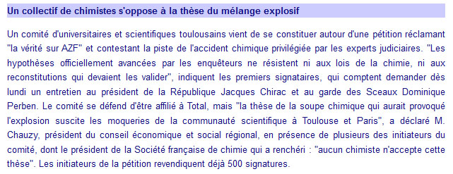 Depuis les tous débuts de l'affaire AZF, de très nombreux chimistes ont été incrédules devant la thèse de l'accident chimique telle que présentée par les experts judiciaires. Dès 2004, la Société Chimique de France avait publié une pétition de plus de 4000 noms de professionels mettant fortement en doute cette version du collège d'experts judiciaires de Daniel Van Schendel, Didier Bergues et François Barat.