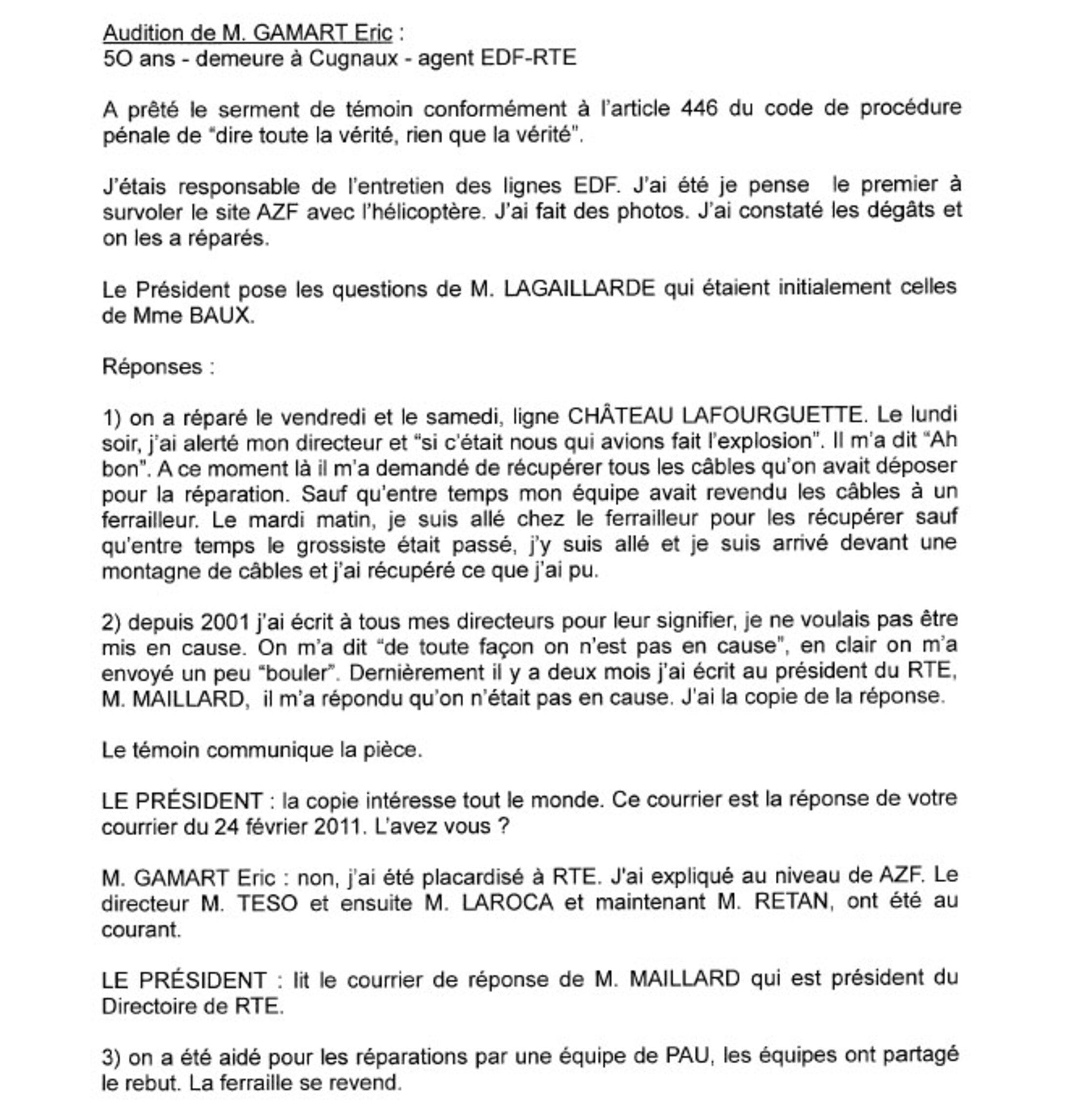 Lors de l’audience du 15 décembre 2011, la Cour d’appel de Toulouse a entendu le témoignage stupéfiant d’un employé d’EDF-RTE. La direction d’EDF-RTE a permis la livraison à la justice d'un faux câble 63 kV qui aurait été sectionné lors de l'explosion et réclamé par les experts judiciaires 10 mois après les faits..
