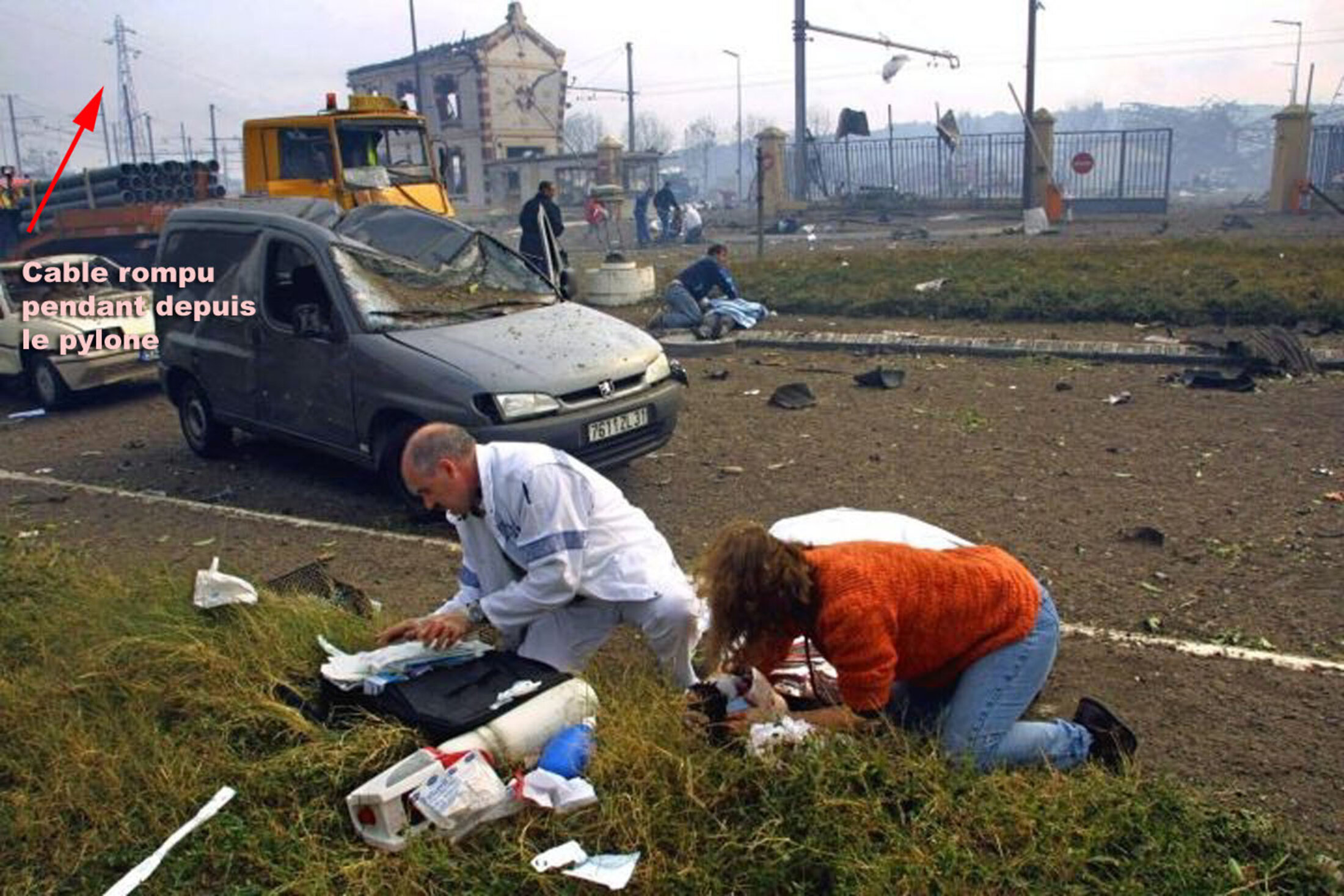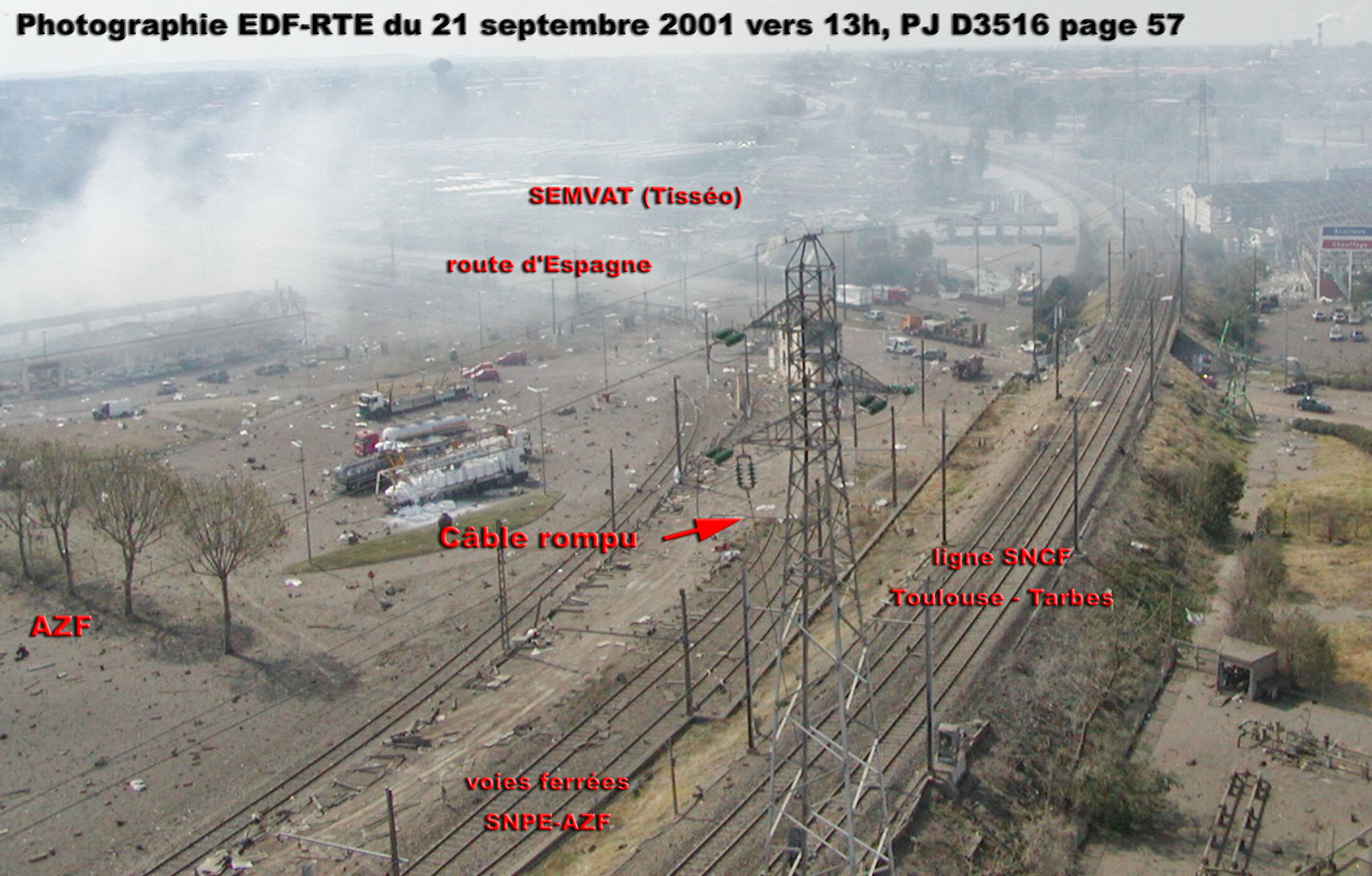 Le jour de l’explosion, moins de trois heures après la catastrophe, une équipe d’EDF-RTE de Toulouse a survolé en hélicoptère le site du pôle chimique pour contrôler l’état des lignes électriques haute tension qui l’environnent. Deux équipes de Toulouse et de Pau ont récupéré sur le terrain même, les restes d’un long câble 63 kV de 330 mètres de long qui a brutalement cassé au dessus de la voie ferrée Toulouse – Tarbes à moins de 250 mètres au nord-ouest du cratère. Chacune de ces deux équipes a débité ce grand câble et, n’ayant aucune directive de leur direction pour les remettre à la justice, comme pour de nombreuses chutes de câbles, ils les ont vendus quelques jours plus tard à des ferrailleurs de leur propre région.