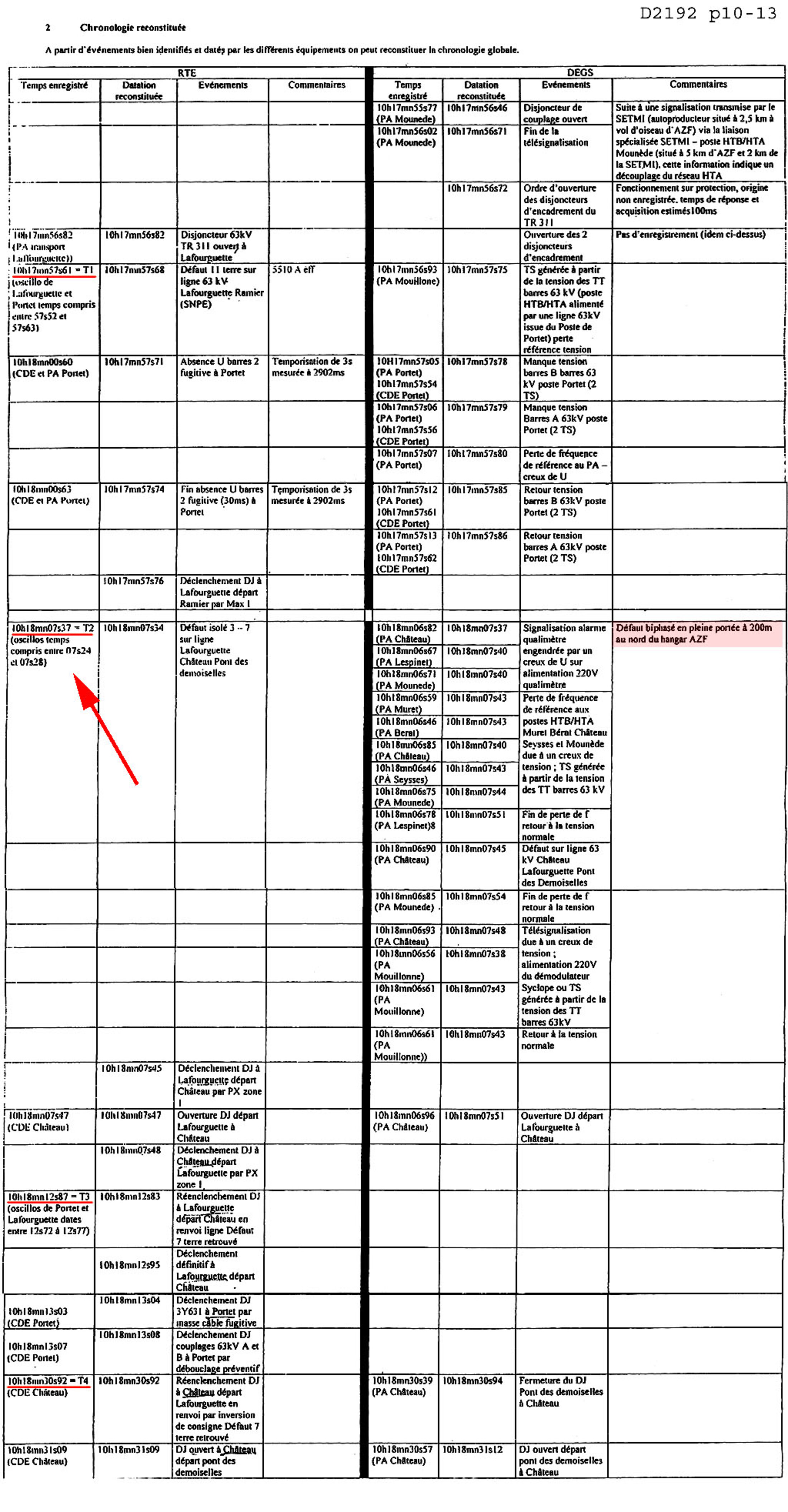 Une fois le principe de la rupture mécanique confirmé sur les deux faux tronçons de câble, les experts électriciens vont alors publier un scénario pour expliquer la rupture du câble et surtout la date très tardive à laquelle elle est survenue… soit près de 12 secondes après l’heure officielle de l’explosion du tas d’ammonitrate. Cette rupture de câble a été immédiatement précédée par un court-circuit entre deux des trois phases de cette lignes 63 kV. Elle est donc très bien datée par les enregistreurs des incidents d’EDF à Toulouse.