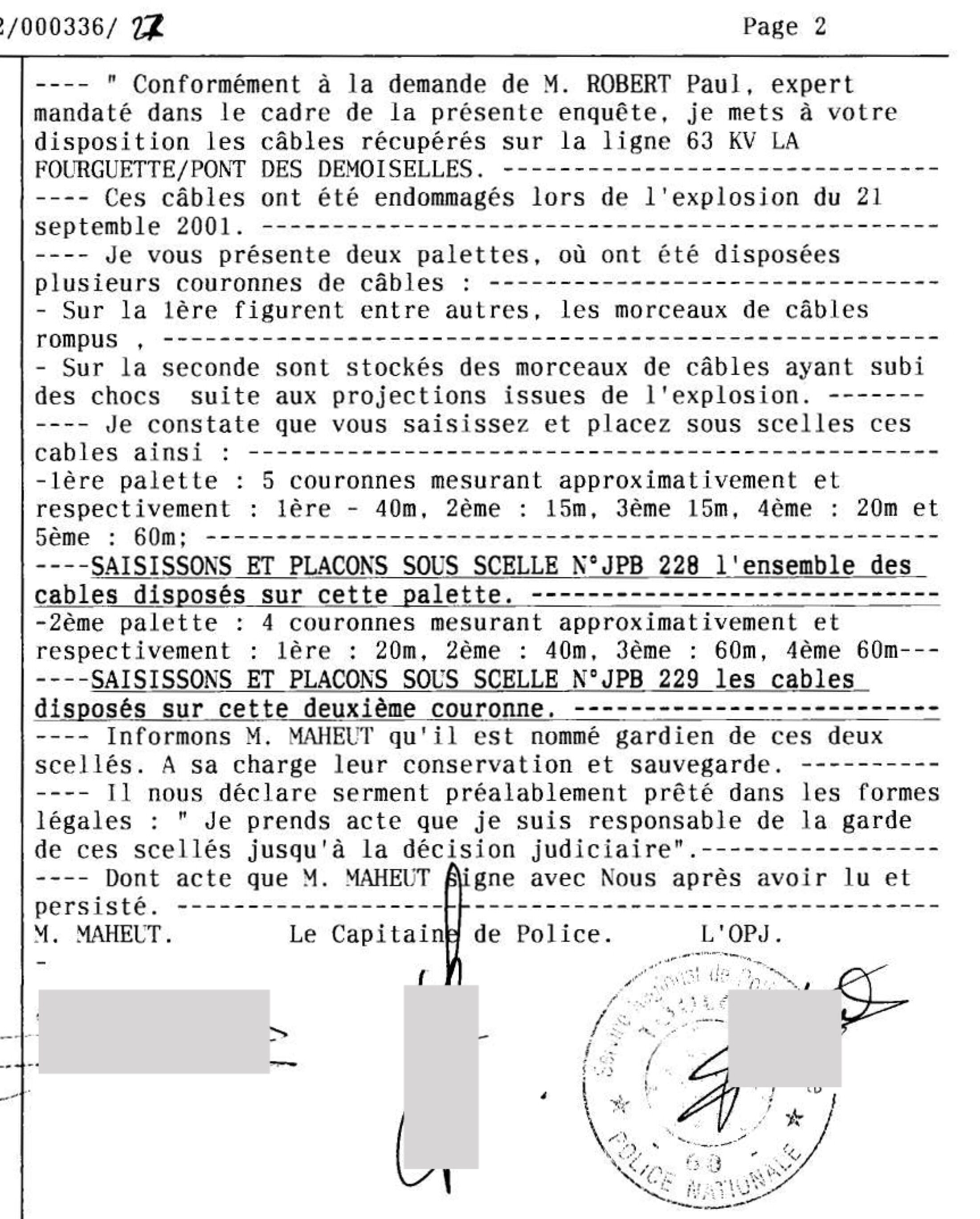Ils ne vont même pas y chercher les quelques traces de produits chimiques projetés depuis le hangar 221. Ils ne vont demander aucun document administratif à EDF-RTE pour suivre le parcours de ces pièces durant les 10 mois qui ont précédé leur saisie tardive. Ils ne vont même pas demander à ce que les brins des deux bouts de câbles rompus soient comparés brin par brin ni même à contrôler que la rupture soit bien conforme avec chacun des deux tronçons.