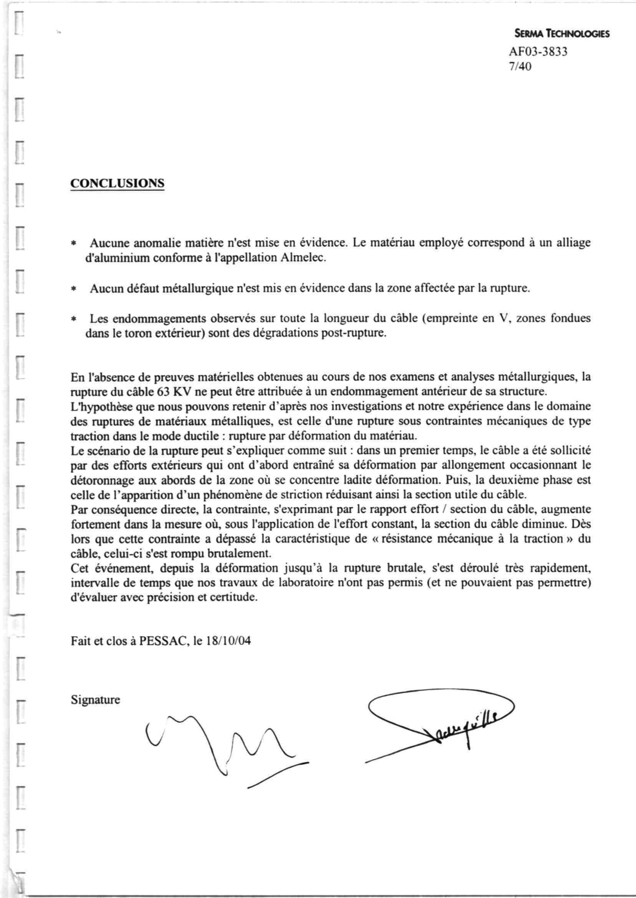 La société Serma-Technologies, chargée de cette expertise technique analysera donc cette rupture séparément pour chacun de ces deux câbles. Elle conclura à une rupture mécanique par un projectile capable de les trancher... normal, ces faux câbles ont très probablement été coupés par EDF-RTE sur le terrain d’une ligne classique lors d’une maintenance. Elle indiquera un étirement du câble, qui arrive bien entendu fréquemment lorsque par exemple des arbres s’écroulent sur une ligne.