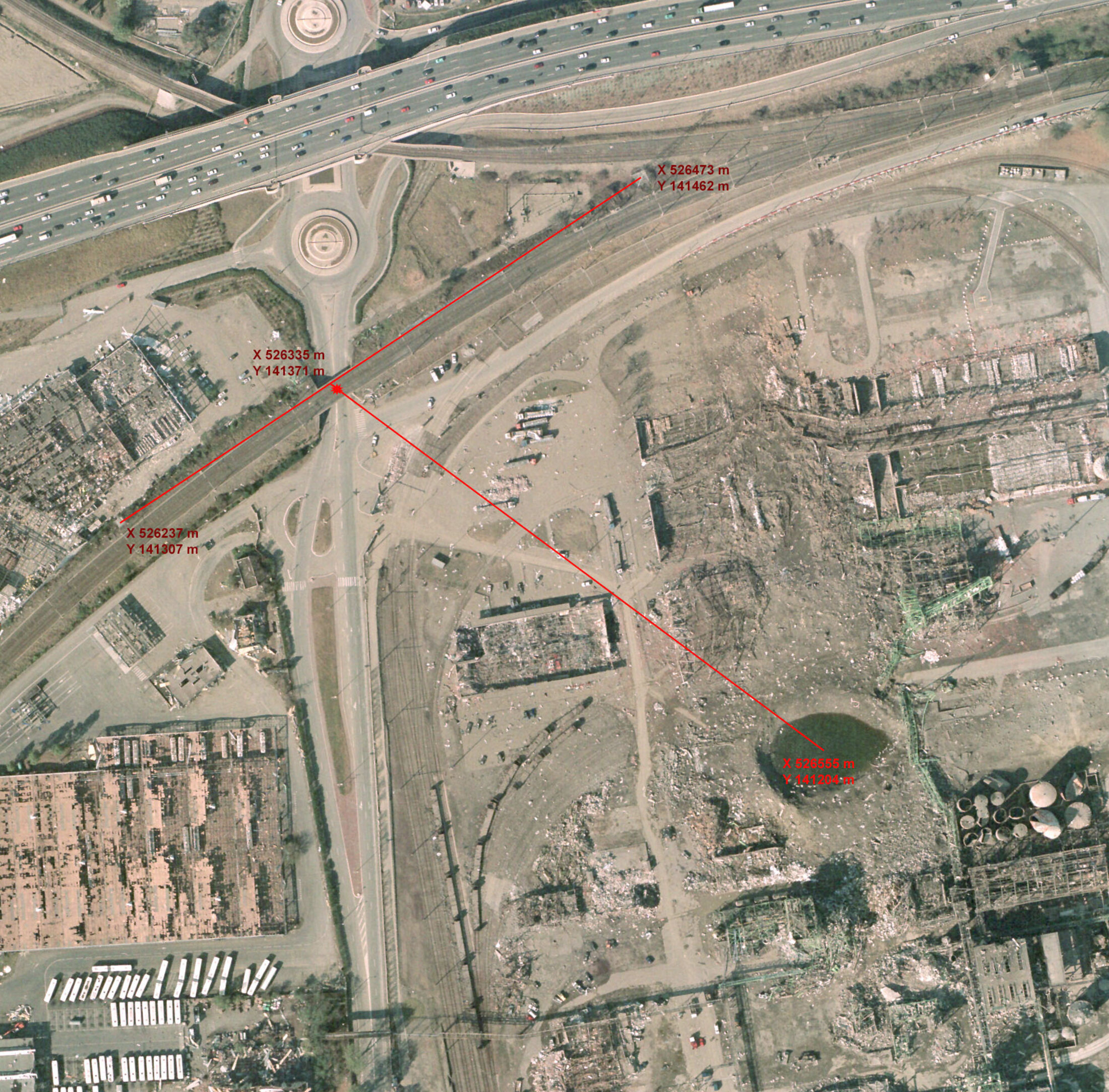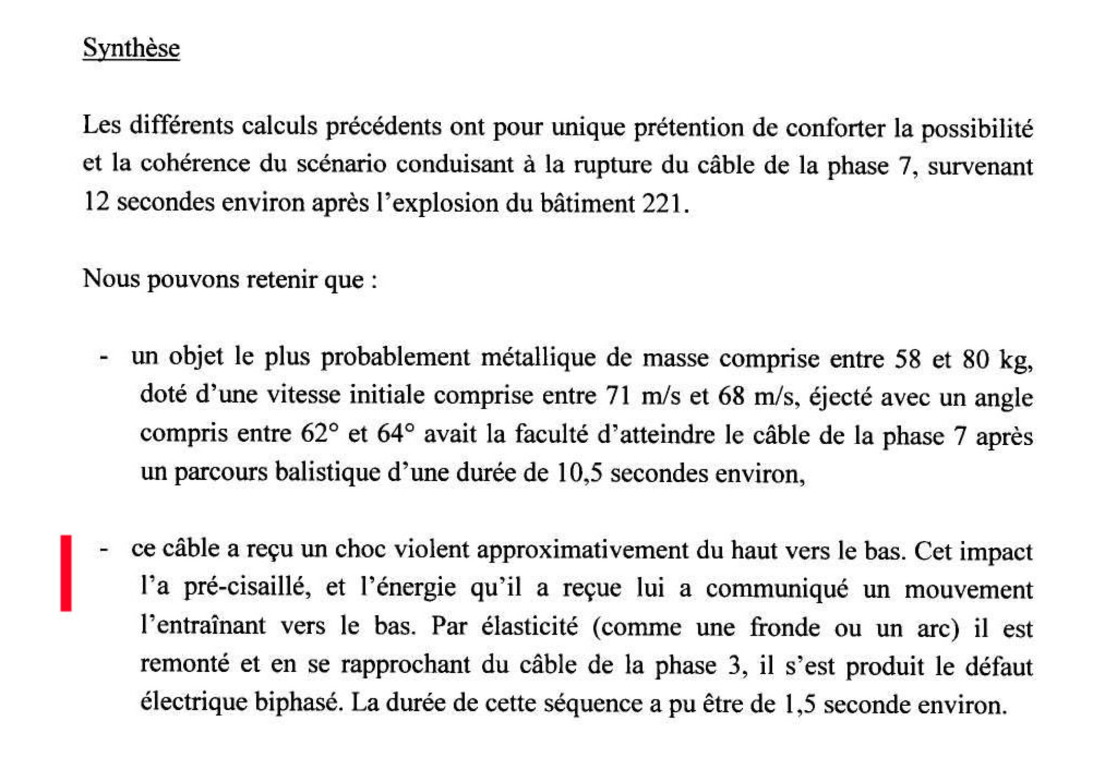 Se basant uniquement sur le type de rupture de ce câble et sur l’heure de rupture, les experts judiciaires vont donc proposer le seul scénario possible à leurs yeux : un hypothétique projectile de 80 kg issu de la zone de l’explosion aurait donc mis près de 12 secondes pour atteindre à 250 mètres de là, le câble 63 kV. Avec une vitesse moyenne apparente horizontale de 75 km/h extrêmement faible, les experts ont dû inventer une trajectoire parabolique extrêmement haute d’un objet retombant pile poil sur le câble le plus bas des 3 phases de la ligne HT, courbant lourdement la flèche du câble vers le bas puis, la laissant remonter vers le haut verticalement et élastiquement, provocant alors le court-circuit avec le câble voisin, puis sa rupture soudaine.