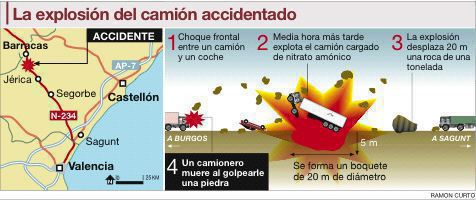 En Espagne, le 9 mars 2004, vers 13h, à Barracas près de Valencia, un camion de 25 tonnes de NA explose suite à un accident et à un incendie d’une demi-heure. Un cratère de 5 mètres de profondeur et de 20 mètres de diamètre est créé au bord de la route. Une station sismologique pyrénéenne a du mal à mesurer plus de 1.4 de magnitude correspondant à une énergie 1000 fois plus faible que celle captée sismiquement le 21 septembre 2001 !