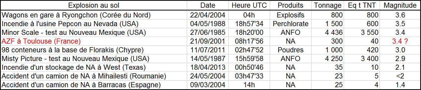 Le seul cas connu de magnitude significative par rapport au tonnage annoncé fut celui d’une explosion de deux wagons en Corée du Nord à Ryongchon, le 22 avril 2004. Le cratère est immense et très profond. Plus de 160 morts sont à déplorer. Toutes les communications de la ville furent brutalement coupées. Les stations sismiques japonaises captent une magnitude de 3.6. Mais les responsables de l’organisme sur le Traité d’Interdiction Complète des Essais Nucléaires (TICEN ou CTBT) sont certains que les Coréens du Nord leur mentent en affirmant que ces wagons ne contenaient qu’un équivalent de 100 tonnes TNT de Nitrate d’Ammonium. Pour le CTBTO, afin d’expliquer l’impact sismique, le tonnage d’équivalent TNT est d’au moins 800 tonnes et les wagons auraient été susceptibles de contenir de puissants explosifs. Le rapport énergétique entre les magnitudes 3.6 et 3.4 d’AZF est de x2. S’ils étudiaient le cas AZF, les responsables du CTBTO verraient donc AZF avec un équivalent TNT d’au moins 400 tonnes, une consommation de 1 350 t de NA et un stockage global de NA d’au moins 3 000 à 4 000 tonnes,… on se rapproche du cas texan !