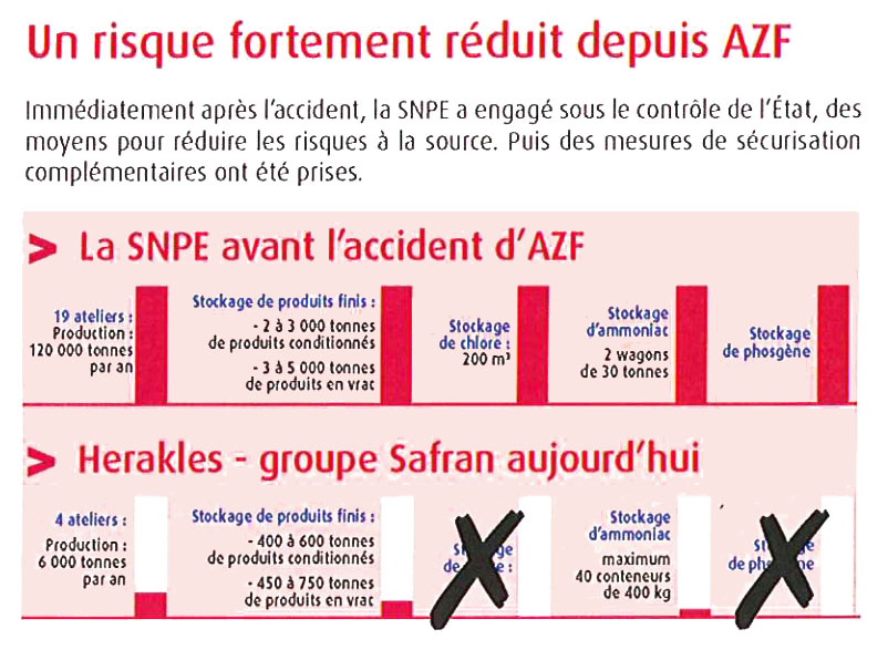 A noter que l’usine d’Héraklès (ex-SNPE), malgré la catastrophe de sa voisine AZF, est toujours en activité et peut, pour maintenant et pour les années à venir, stocker sur l’île du Ramier à deux pas du centre ville, jusqu’à 1 350 tonnes de produits finis dont divers comburants et un maximum de 70 t de Perchlorate d'Ammonium nécessaire au carburant de la fusée Ariane et aux missiles.