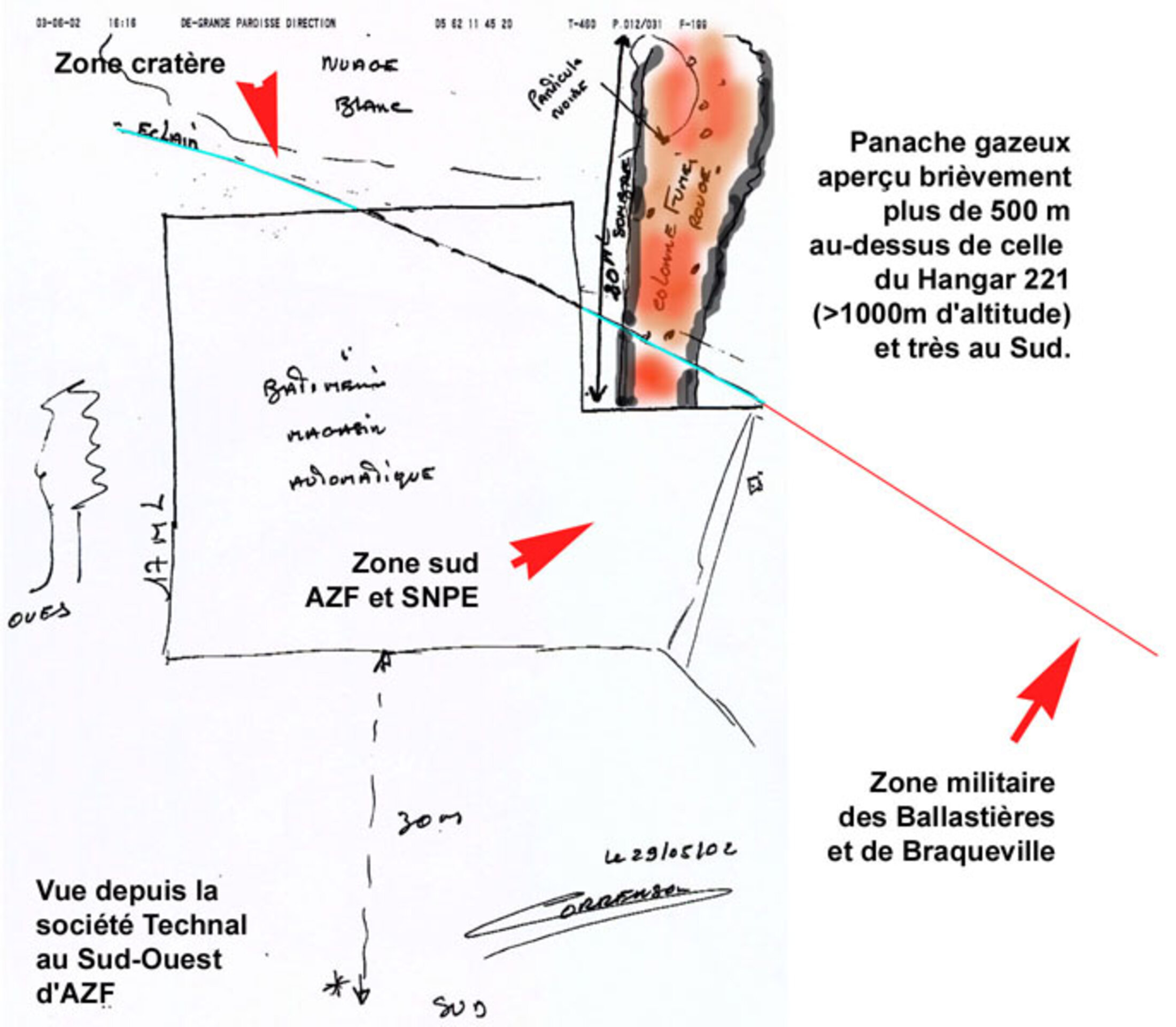 M. Michel Vaginay (attestation dans la cote D3113), depuis sa voiture, sur la bretelle d'accès à l'autoroute A64, vers le Sud, a vu aussi un grand faisceau oblique surgir derrière la base de la tour d'urée d'AZF rouge et blanche qu'il voyait face à lui. Lui aussi a vu ce faisceau naître derrière la tour et donc plus au Sud qu'elle avec une origine pouvant prendre naissance au Sud-Est des terrains de Grande Paroisse. Son premier témoignage communiqué à la gendarmerie le 5 octobre 2001 a été bizarrement filtré par le SRPJ de Toulouse pendant plusieurs années !