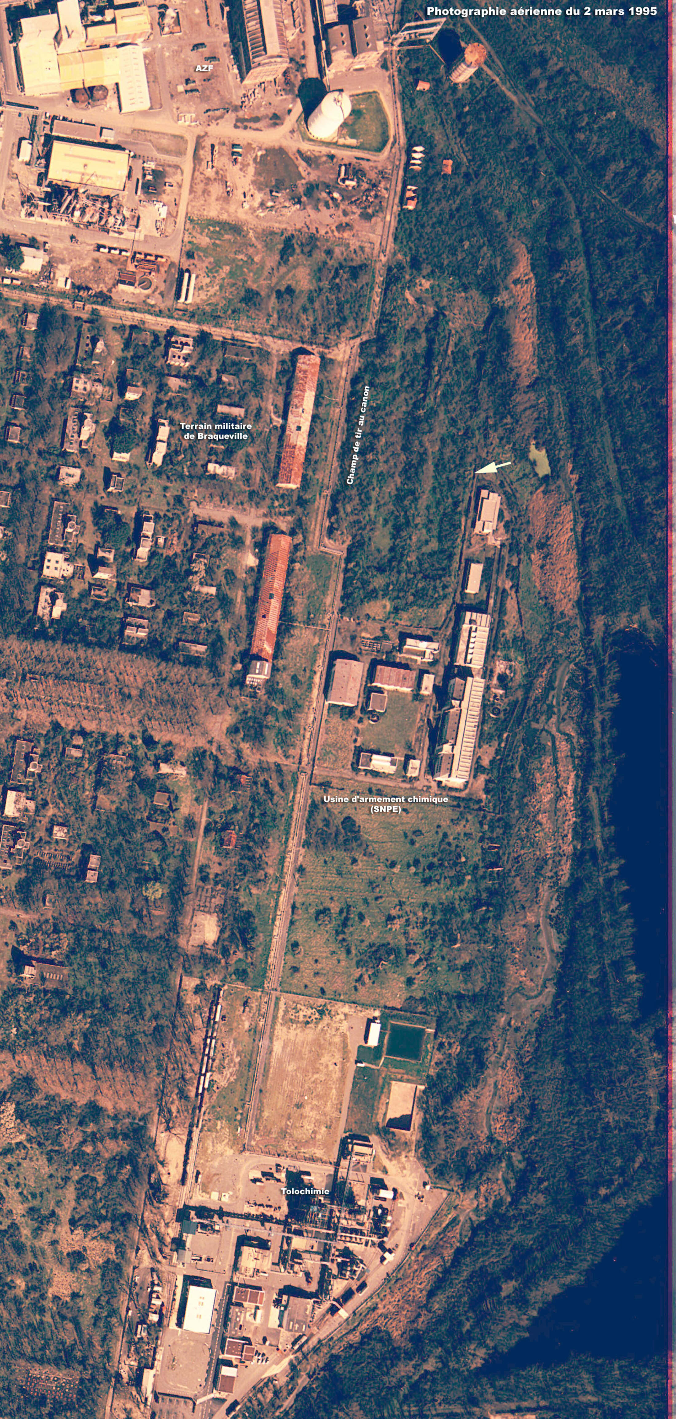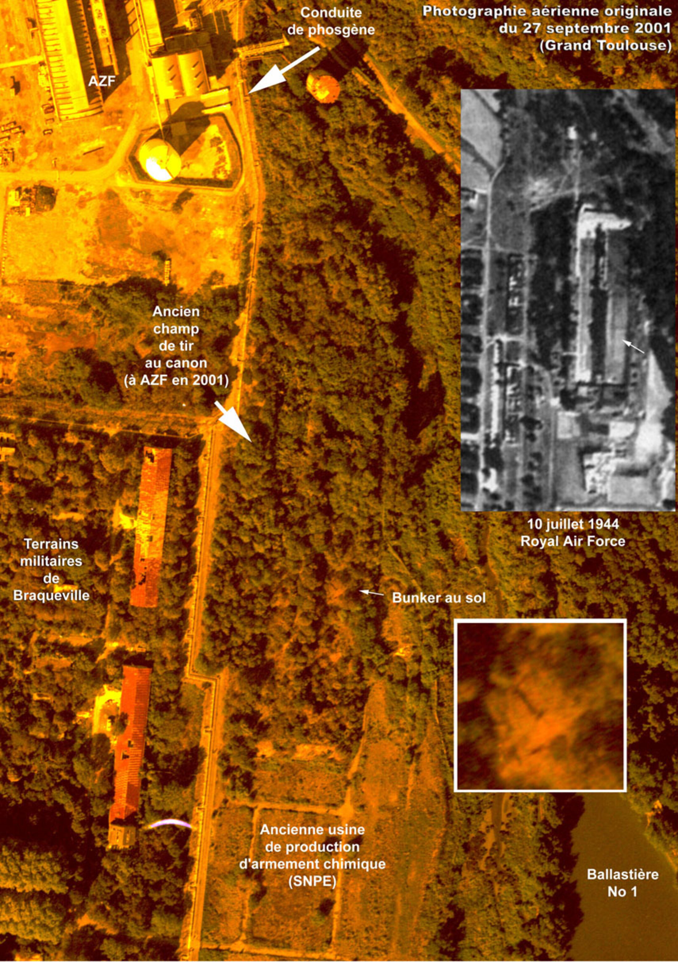 3/- Le bunker visible sur les originaux du 27 septembre 2001 pourrait faire partie d'un réseau souterrain de la Poudrerie Nationale de Toulouse qui passe encore aujourd'hui sous l'usine SNPE, le secteur de Tolochimie et les terrains militaires de Braqueville. en passant auparavant sous les anciennes installations de l'usine de production d'armement chimique secrète arrêtée en 1987 juste avant la cession des terrains la voisinant à Grande Paroisse.