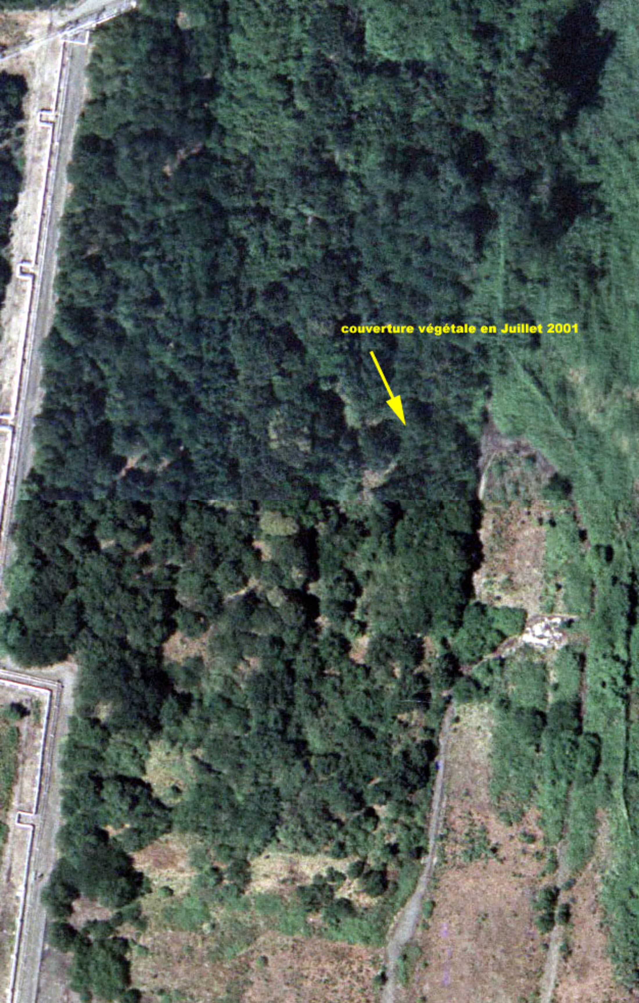 2/- Une différence notable de végétation entre juillet et septembre 2001 montre la trace d'une activité à au moins un endroit de ce secteur de Grande Paroisse qui a nécessité l'enlèvement d'une partie de la végétation.