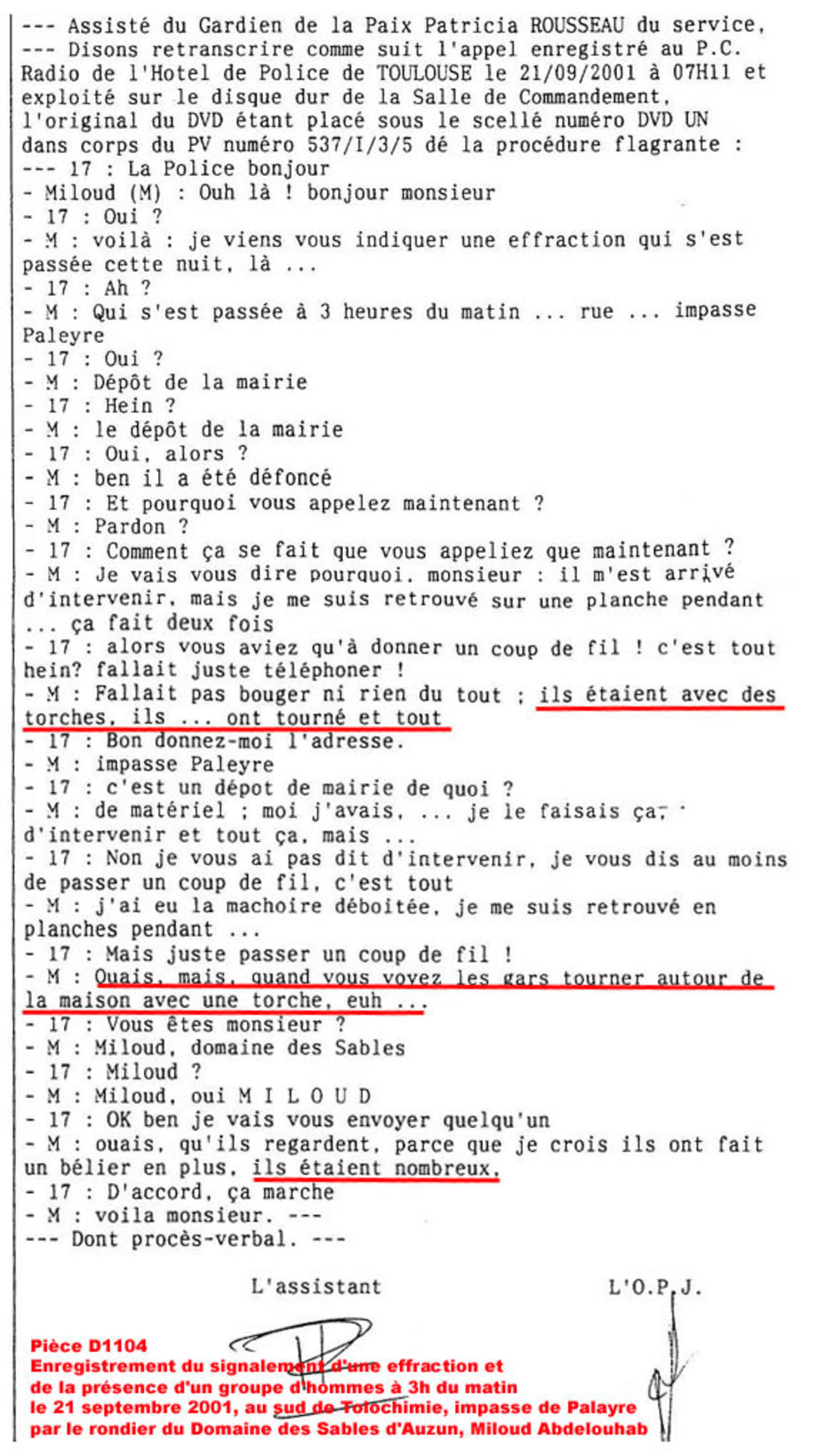 Un autre témoin a vu un groupe d'homme important munis de torches dans le secteur sud de Tolochimie à moins de 300 mètres de cette zone maquillée, dans la nuit du 20 au 21 septembre 2001. Il faisait une ronde pour le compte du Domaine des Sables d'Auzun et a vu ces hommes à 3 heures du matin. A 7 heures du matin il prévint la police pour signaler cet événement et également le forçage du portail d'un local municipal situé face à Tolochimie, constaté au lever du jour. Ce témoin fut étrangement diffamé par les renseignements généraux dès le 3 octobre 2001, en même temps que M. Hassan Jandoubi qui connaissait son frère. Il dut se défendre des pires suspicions au lieu de voir son témoignage sérieusement étudié par le SRPJ de Toulouse. Les souterrains issus de la SNPE passant très près de son secteur, la présence humaine à 3 heures du matin était des plus intéressantes pour l'enquête AZF-Toulouse. A cette même heure de 3 heures du matin, à l'autre bout des souterrains concernés par le secteur maquillé, au poste de garde de la SNPE, émergeaient trois hommes inconnus du personnel dont un, grièvement blessé. Les pompiers de la caserne Vion arrivèrent en premier. Les deux inconnus valides sortirent sans se faire enregistrer du site, le blessé grave put sortir par une ambulance privée externe à la SNPE, appelée par le préfet Hubert Fournier, mais il y mourut vers 4h30 sans laisser la moindre trace administrative. Une plainte contre X a été déposée en Septembre 2008 pour que des témoins de ces événements puissent être entendus avec toutes les protections nécessaires mais cette plainte fut classée sans suite deux mois plus tard par le procureur de la République de Toulouse. Un de ces témoins était le chauffeur de l'ambulance privée, un autre connaissait les souterrains de la SNPE, un autre avait les informations détaillées des pompiers.