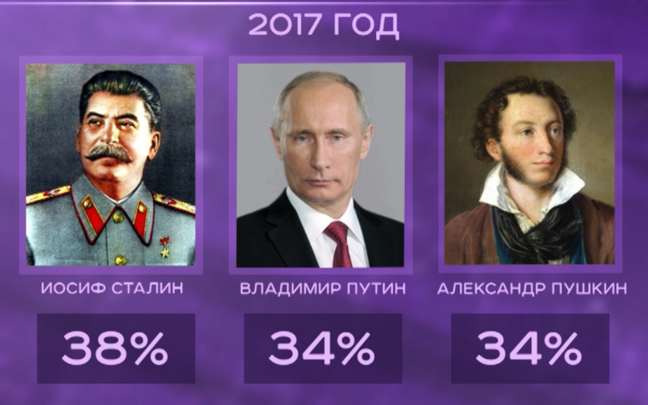 Dernièrement, un sondage d’opinion réalisé par le centre Levada met en évidence ce syndrome post-impérial. 38 % des personnes interrogées estiment que Joseph Staline est le principal personnage historique. Avec 34 %, Vladimir Poutin et Alexandre Pouchkine occupent la deuxième place.