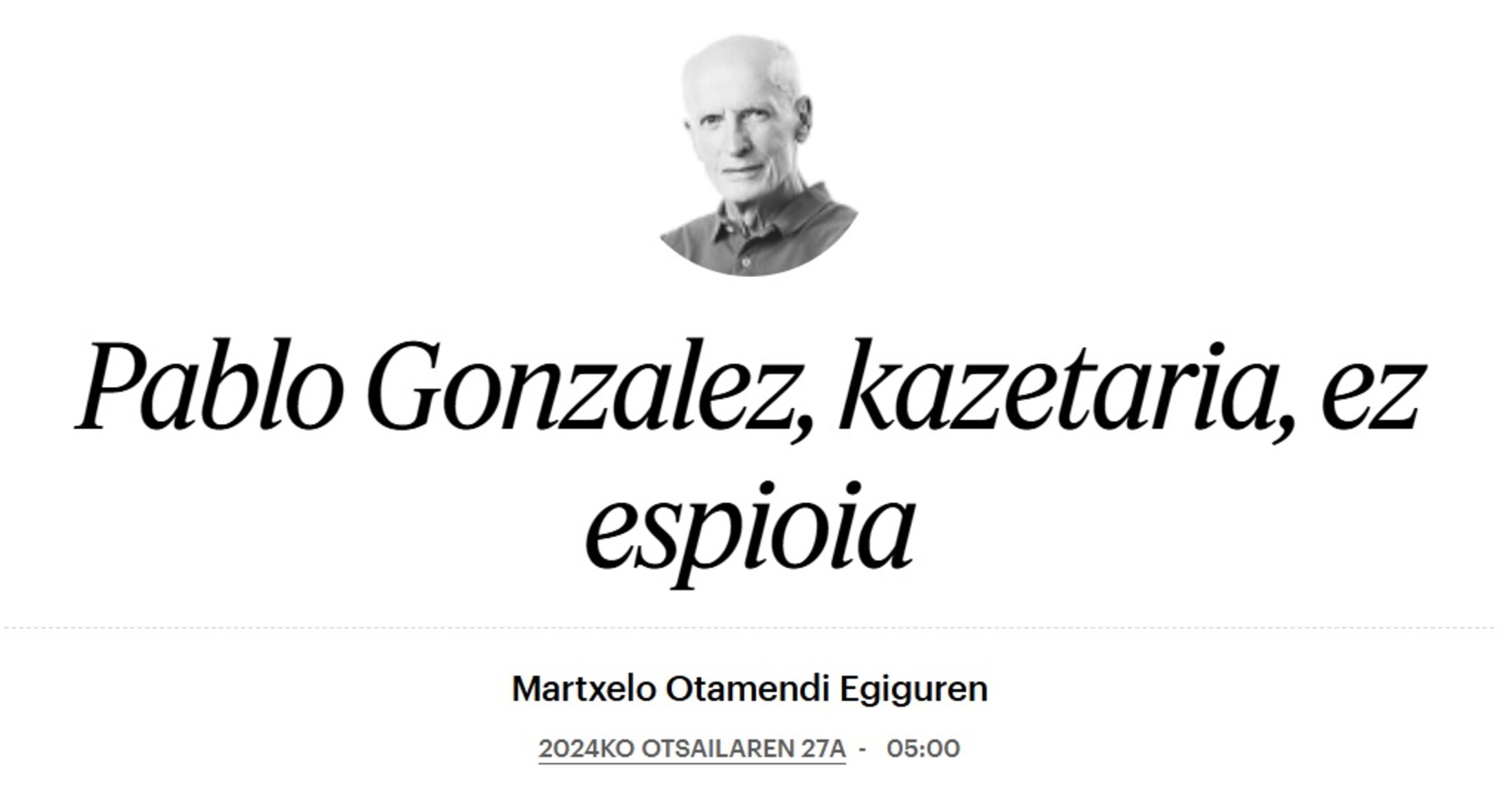 Le mouvement nationaliste basque s’est uni pour faire libérer l’agent du GRU, Pablo Gonzalez. À sa tête, on trouve Martxelo Otamendi, du journal Berria. En tant que lecteur du journal Berria, j’ai résilié mon abonnement en 2014, car je suis conscient de la propagande russe en russe et je n’ai pas besoin d’une traduction en basque. Les journalistes de Berria, ainsi que la publication elle-même, sous la direction de Martxelo Otamendi, sont des propagandistes de Poutine.