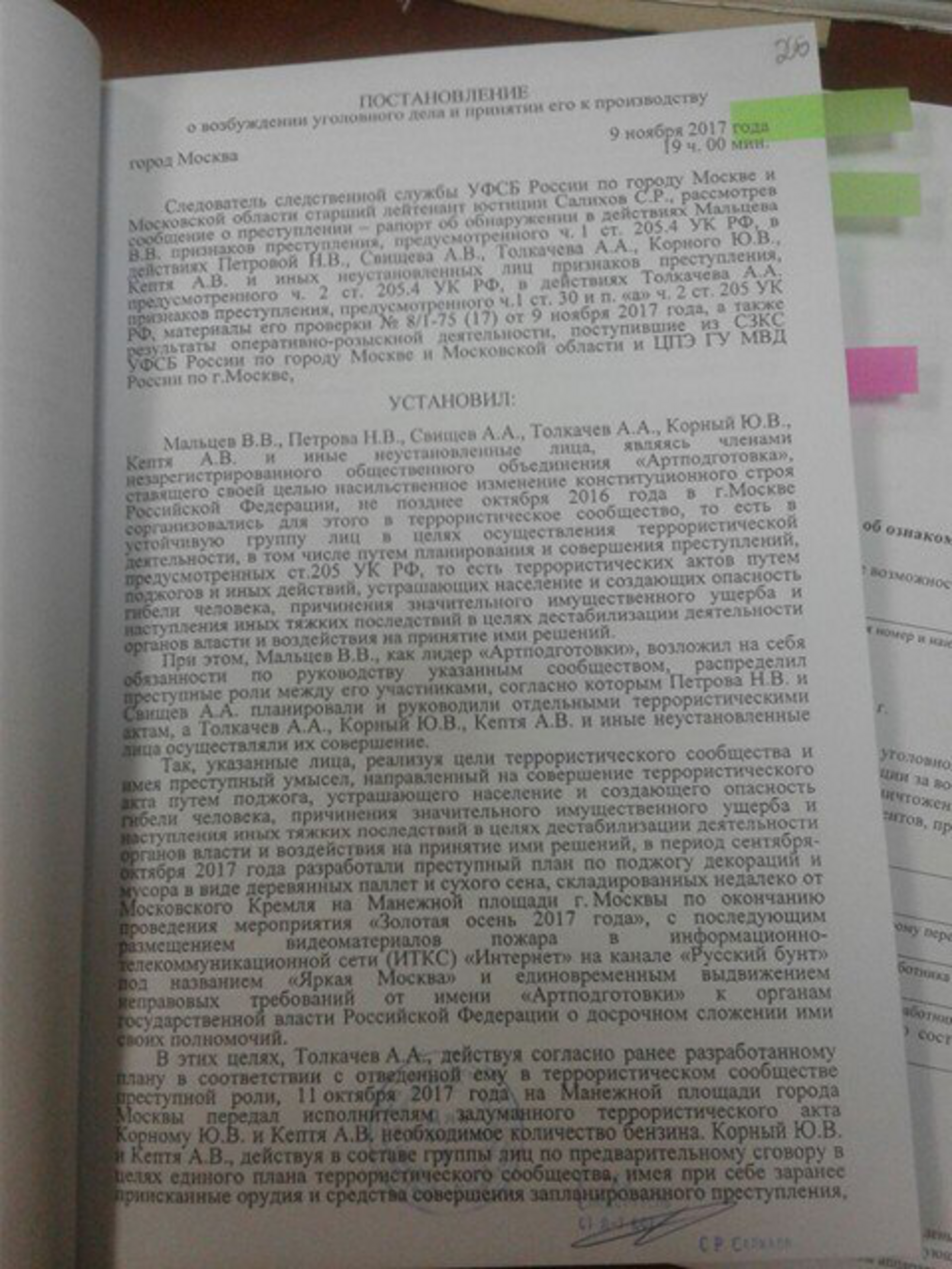 Maltsev V, Petrova N, Svishchev A, Tolkachev A, Kornev Y, Cheptia A et d’autres personnes non identifiées, en tant que membres d’une association publique non enregistrée « Artpodgotovka » destinée à modifier l’ordre constitutionnel de la Fédération de Russie, se sont organisées dès octobre 2016 à Moscou en communauté terroriste, c’est-à-dire en groupe permanent de personnes désirant mener des activités terroristes, y compris en planifiant et en commettant des crimes tels ceux définis par l’article 205 du Code pénal de la Fédération de Russie, c’est-à-dire en commettant des actes pour terroriser la population, en mettant en danger la vie humaine, en causant des dommages matériels importants et d’autres conséquences graves dans le but de déstabilisation le pouvoir et avoir un impact sur les prises de décision de ce dernier.
