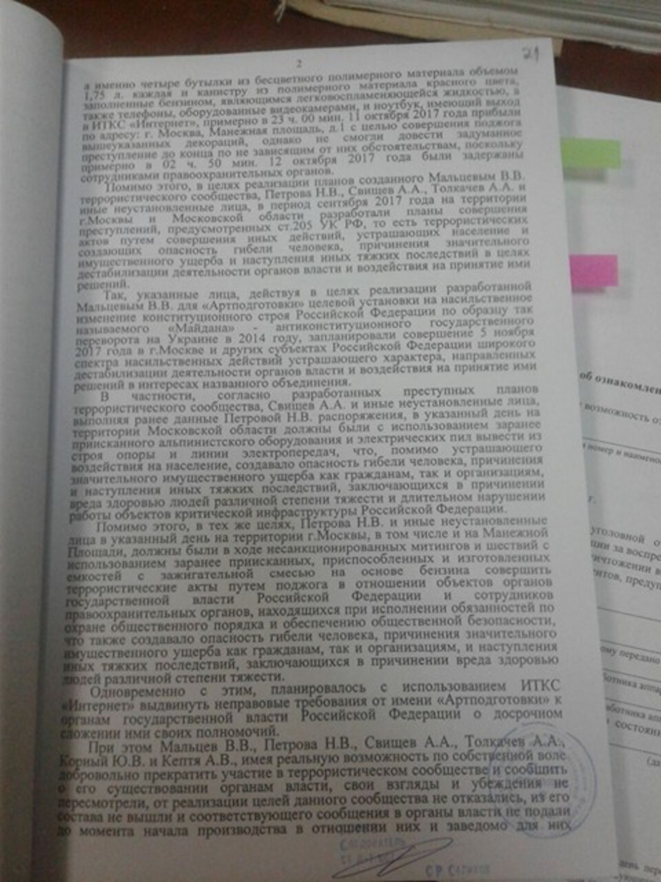 En outre, dans la période de septembre 2017, sur le territoire de Moscou et la région de Moscou, afin de mettre en œuvre les plans élaborés par Maltsev V et son organisation terroriste, Petrova N, Svishchev A, Tolkachev A, et d’autres personnes non identifiées ont élaboré des plans pour commettre des crimes en vertu de l’article 206 du Code criminel, c’est à dire des actes terroristes et d’autres actions d’intimidation de la population en exposant des personnes au danger de mort et en causant des dommages matériels importants et d’autres conséquences graves diverses dans le but de déstabiliser le gouvernement et d’influer sur ses prises de décision, ceci dans l’intérêt de ladite association.