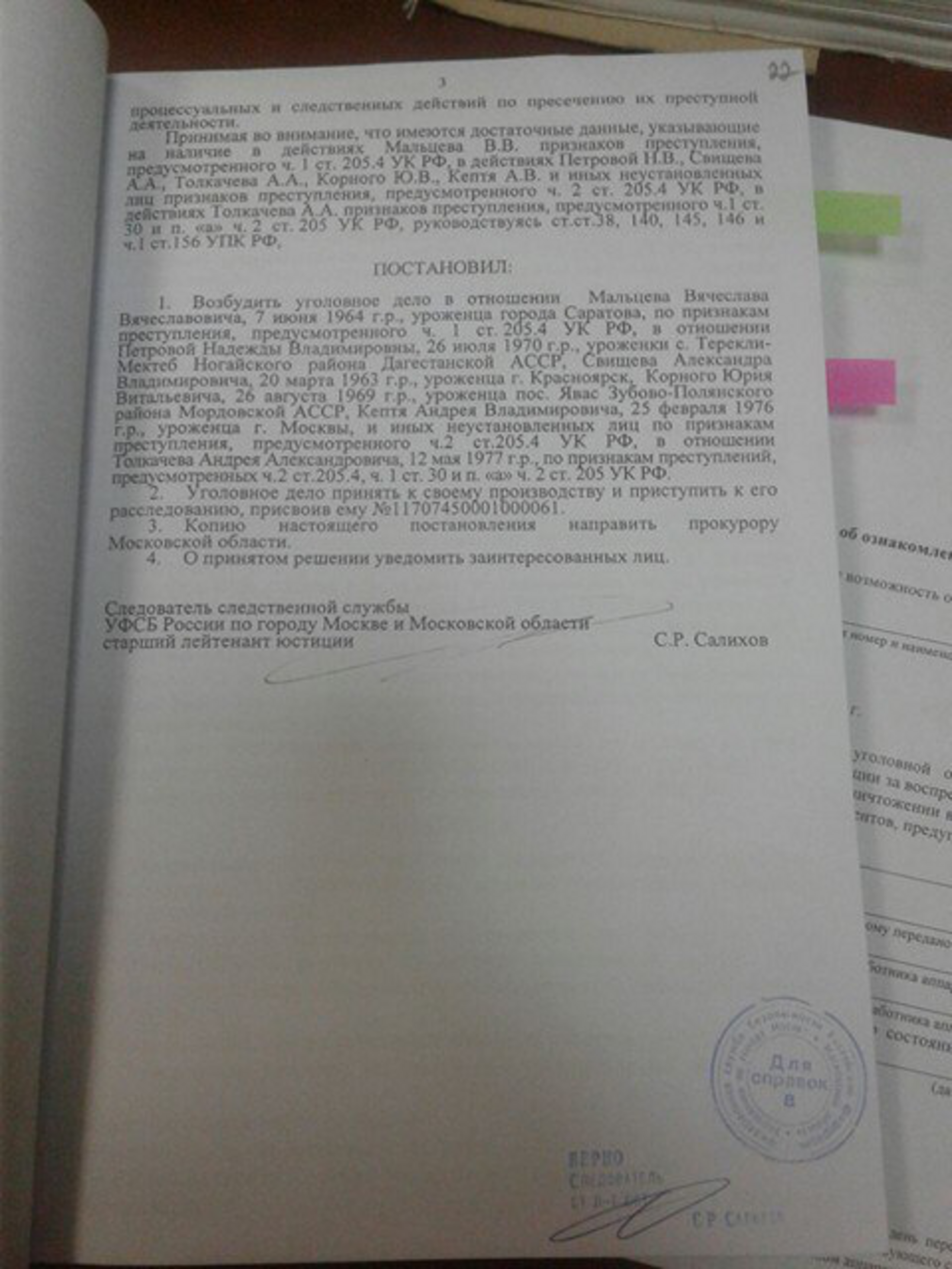 L’enquêteur du service d’enquête du FSB de Russie à Moscou et de la région de Moscou, le lieutenant de justice Salikhov S R, ayant examiné le rapport de l’affaire criminelle et les conclusions des actions de Maltsev Viasheslav assimilables à un crime défini par l’article 205.4 du Code pénal de la Fédération de Russie et les actions de Petrova Nadejda, Svishchev A, Tolkachev A, Korny Yu, Keptya A, et d’autres personnes non identifiées, les infractions définies à la partie 2 de l’article 295.4 du Code pénal de Fédération de Russie et les agissements de Tolkachev A assimilables à un crime en vertu de la partie 1, article 30 et de l’alinéa « a » de la partie 2 de l’article 205, ainsi que les résultats des activités opérationnelles d’enquêtes reçues par le Service fédéral de sécurité de Russie (FSB) à Moscou et de la région de Moscou et des résultats des enquêtes du Centre de lutte contre l’extrémisme de Russie (centre E) à Moscou