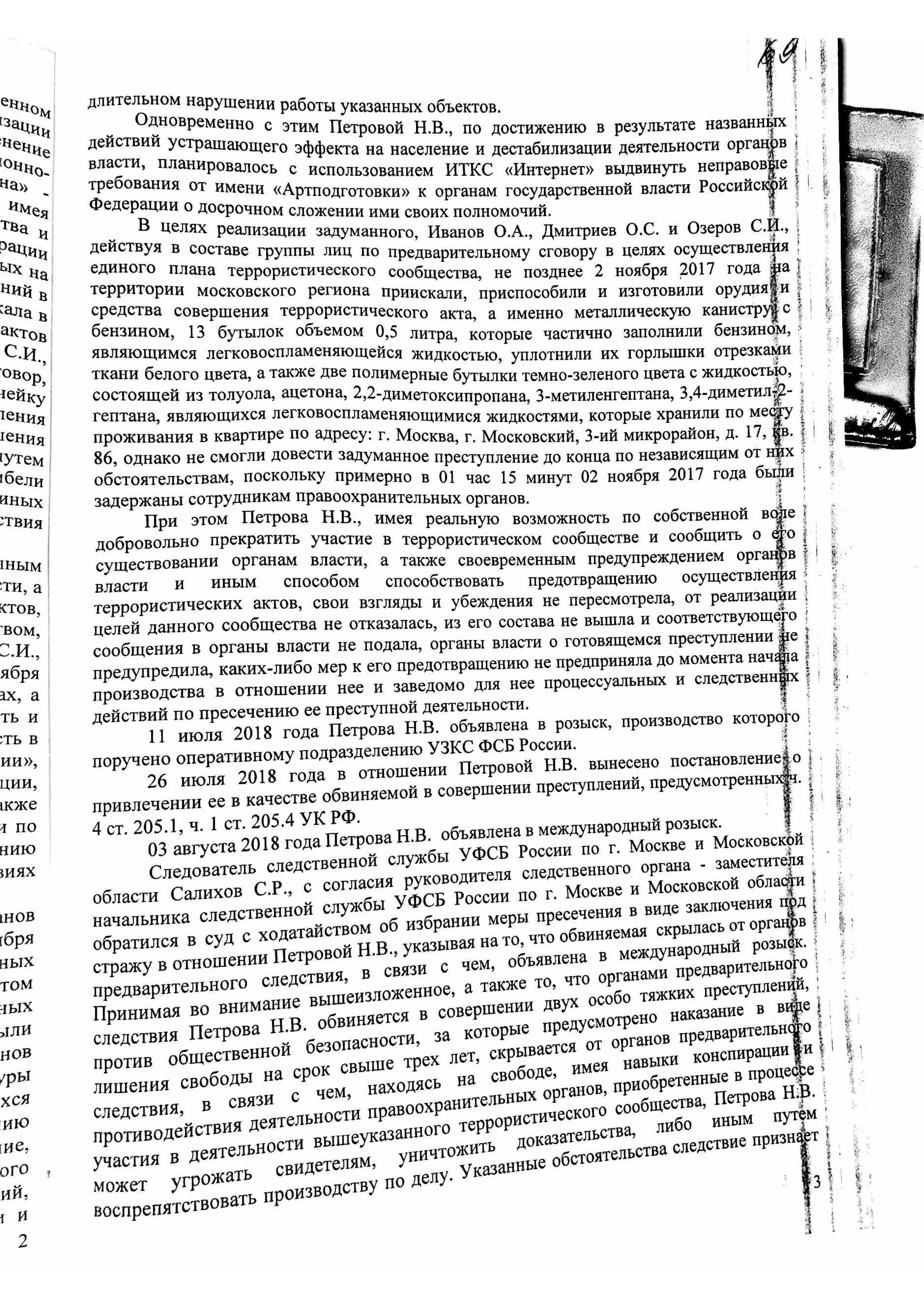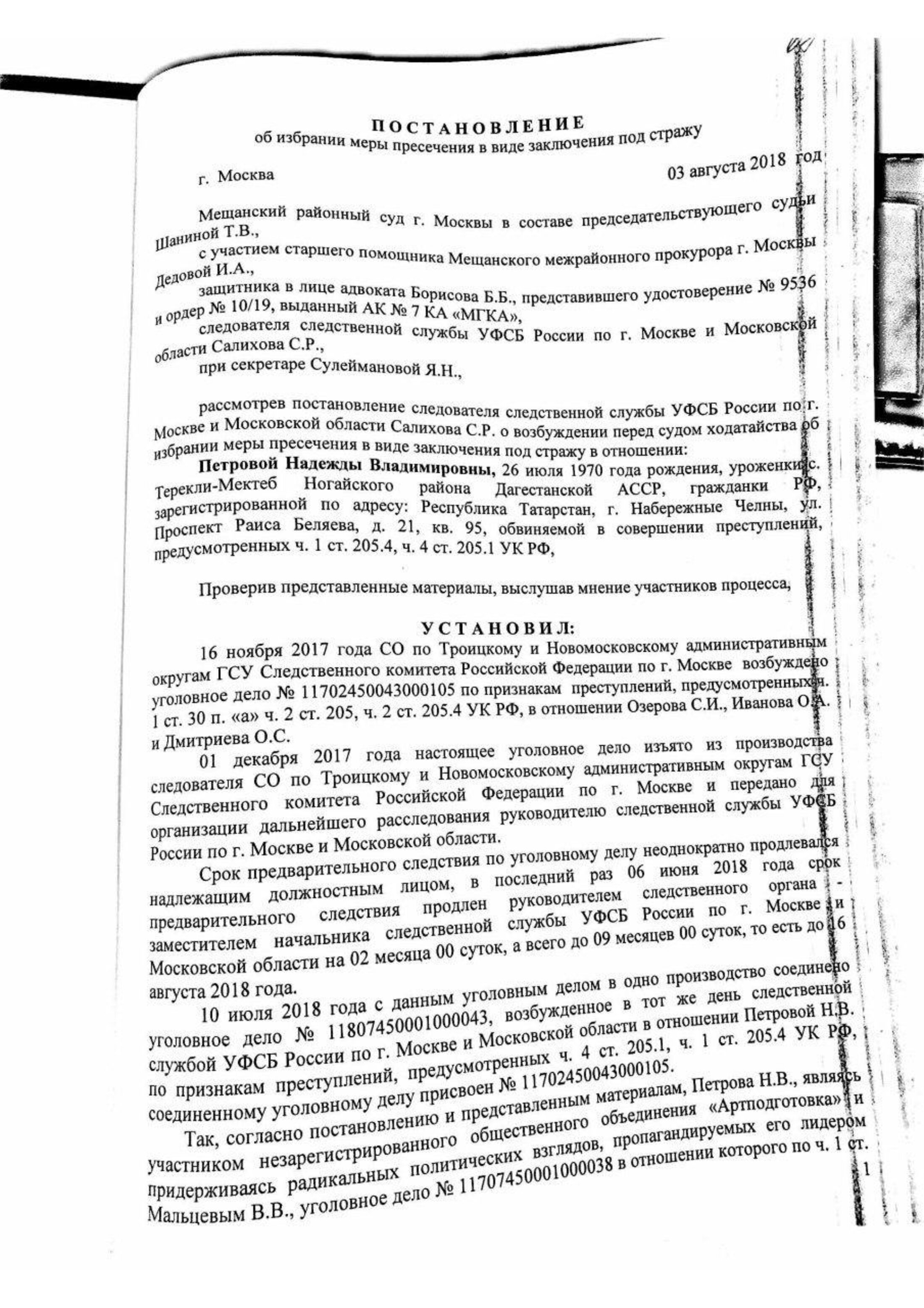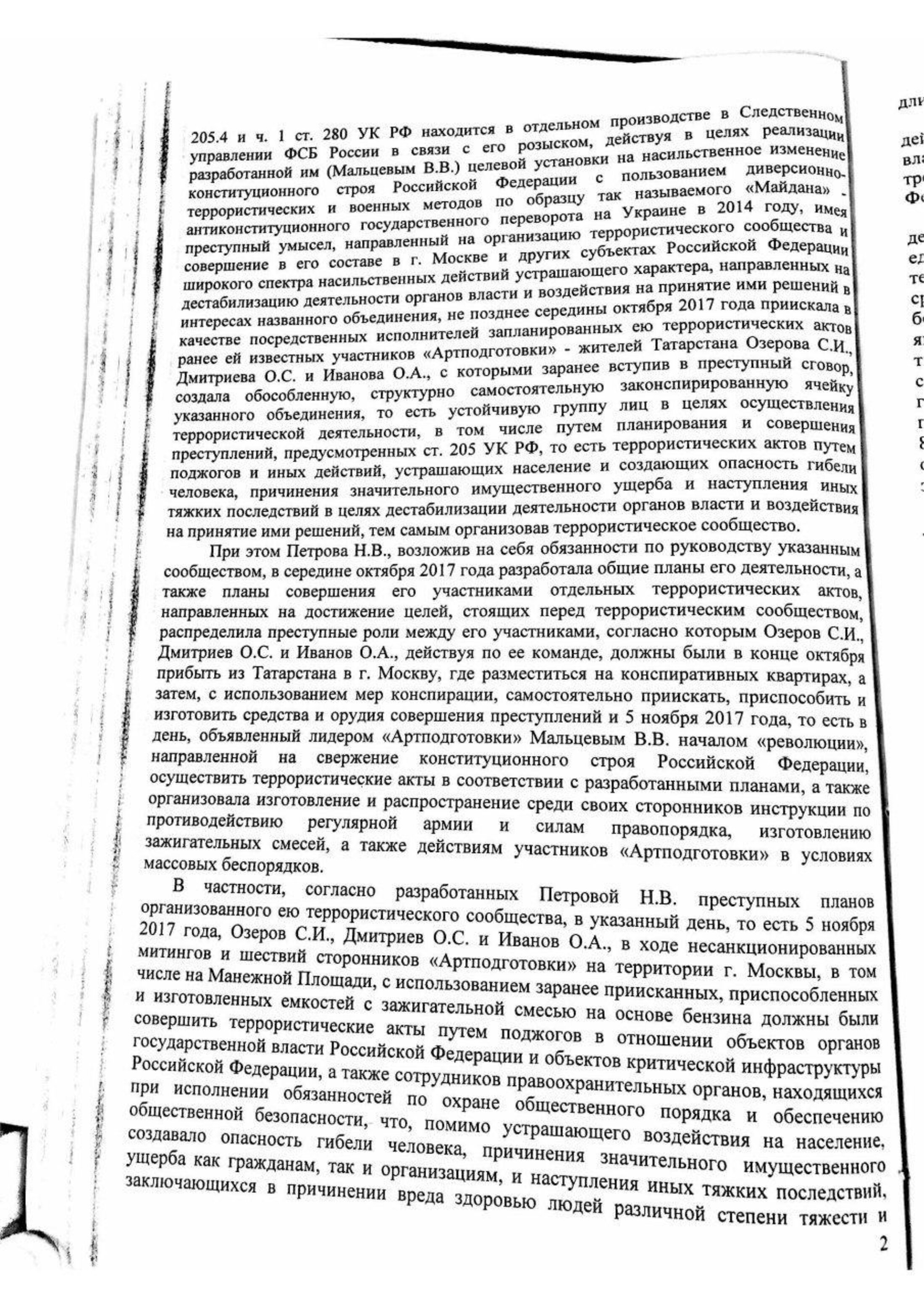 Ainsi, selon la résolution et les documents soumis, Petrova N.V., membre d'une association publique non enregistrée « Artpodgotovka » et adhérante à des opinions politiques radicales, promue par son chef, MaltsevV.V., une affaire pénale N ° 11707450001000038, aux termes de la première partie de l'article 205.4 et de la première partie de l'article 280 du Code pénal de la Fédération de Russie, une enquête distincte est en cours au département des enquêtes du FSB de Russie, agissant afin de mettre en œuvre les intentions développées par Maltsev V.V. de modification violente du système constitutionnel de la Fédération de Russie, utilisant des méthodes de sabotage terroristes et militaires sur le modèle de ce que l'on appelle «Maidan» - le coup d'État anticonstitutionnel en Ukraine en 2014, dans un but criminel visant à organiser une communauté terroriste dans sa structure à Moscou et d'autres régions de la Fédération de Russie, et un nombre importants d'actions violentes à caractère terroriste afin de déstabiliser les activités gouvernementales et occasionner un impact sur ses prises de décision dans l'intérêt de ladite association, au plus tard à la mi-octobre 2017, Pétrova N V a recherché et trouvé des exécutants directs d’actes terroristes qu'elle avait planifiés, avec des individus qu'elle connaissait déjà de « Artpodgotovka» habitants du Tatarstan, S. Ozerov, Dmitriev, Ivanov, avec qui elle avait conclu un complot criminel à l’avance, elle a créé une cellule distincte, structurellement indépendante et conspiratrice, de cette association, c’est-à-dire qu’il existe un groupe permanent de personnes ayant l’intention de planifier des activités terroristes, notamment en commettant des crimes au titre de l’article 205 du Code pénal de la Fédération de Russie, c’est à dire des actes terroristes criminels et autres actes pour intimider la population, créer un danger de mort, causer des dommages matériels importants et d’autres actes ayant des conséquences graves en vue déstabiliser les actions des autorités, influencer leur prise de décision, organisant ainsi une communauté terroriste.