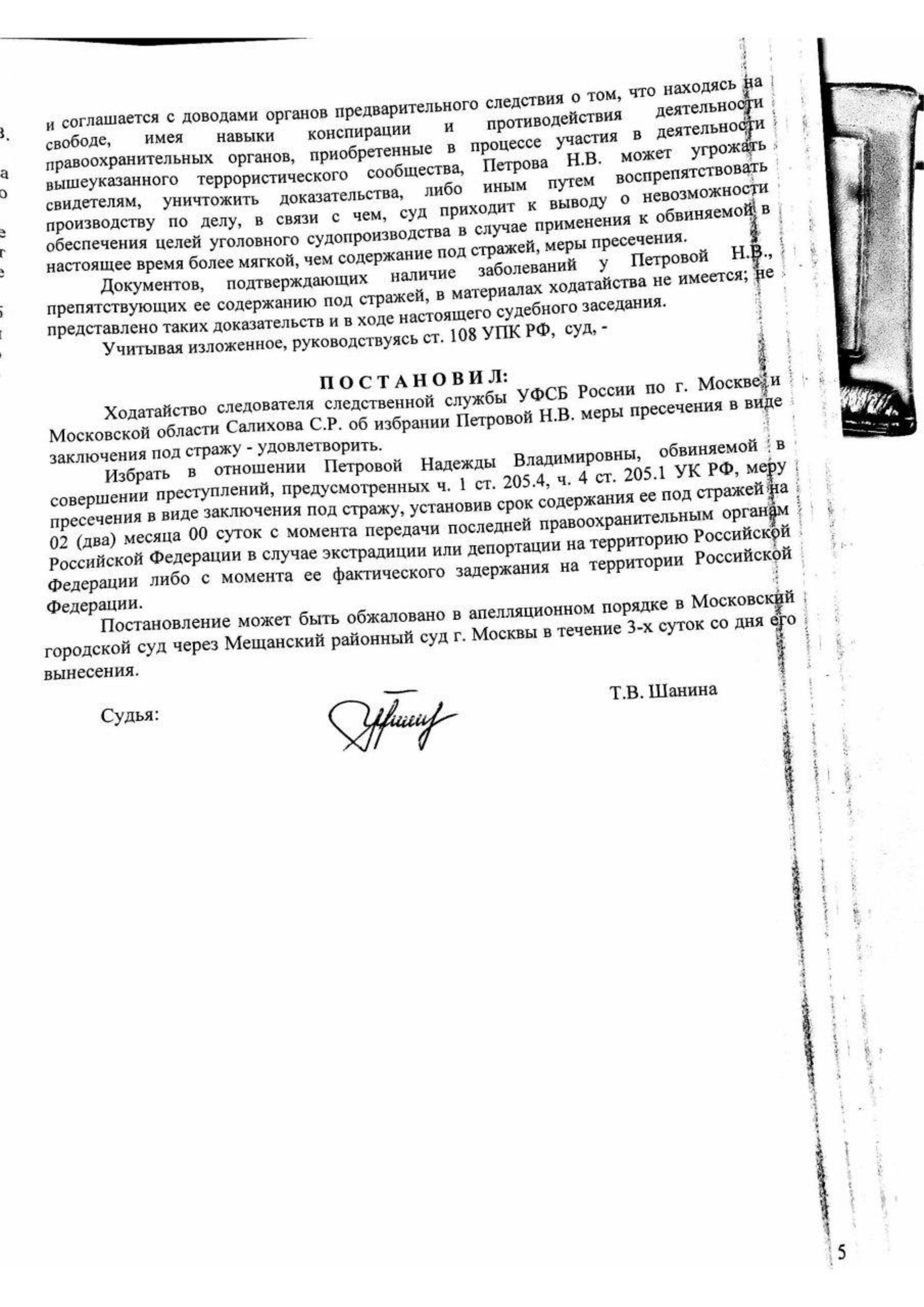 L’enquêteur du service d’enquête du FSB de Russie de la ville de Moscou et de la région de Moscou, Salikhov S.R., avec le consentement du responsable de l’instance d’enquête, chef adjoint du service d’enquête du FSB de Russie à Moscou et de la région de Moscou, a interjeté appel auprès du tribunal pour qu’il décide une mesure de sûreté sous forme de détention contre Petrova NV, compte tenu de ce qui précède, ainsi que du fait que les organes de l’enquête préliminaire ont accusé de Petrova N V d’avoir commis 2 crimes particulièrement graves contre la sécurité publique, passibles de peines d’emprisonnement de plus de trois ans, qu’elle se soustrait aux enquêtes dans le cadre desquelles, étant en fuite, ayant des compétences conspiratrices, elle est capable de contrebalancer les activités des services de recherche et de répression acquise lors de sa participation aux activités de la communauté terroriste susmentionnée, Pétrova N V peut menacer des témoins, détruire des éléments de preuve ou nuire de quelque manière que ce soit à la procédure. L’enquête reconnaît que ces circonstances sont exceptionnelles et considère qu’il est impossible d’appliquer à Petrova N V une autre mesure préventive plus douce.
