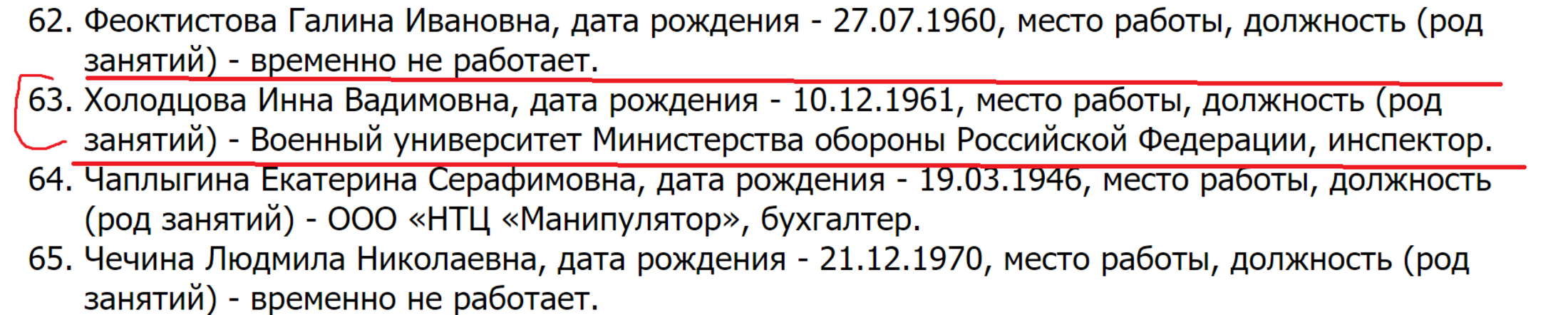 En 2007, Inna Vadimovna Kholodtsova, née le 10 décembre 1961, travaillait en tant qu’inspecteur à l’Académie d’État militaire du ministère de la Défense de la Fédération de Russie.