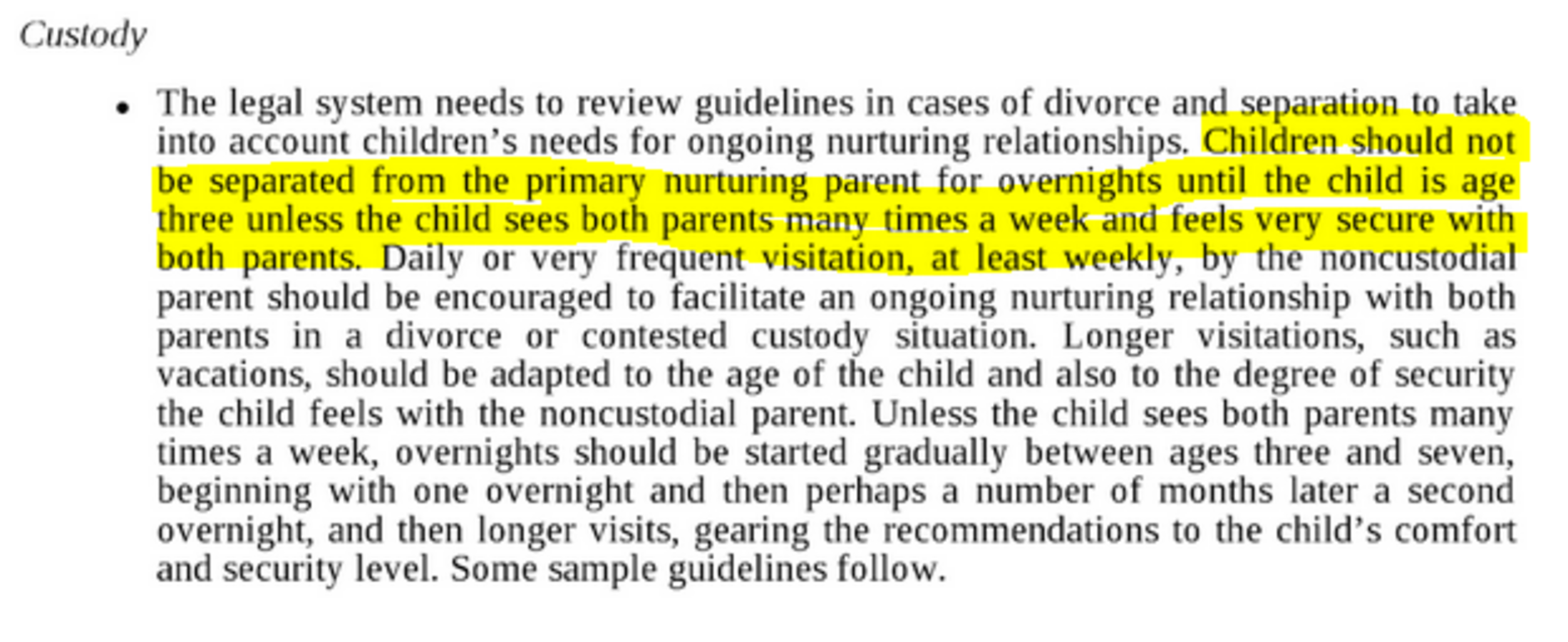Cependant, Monsieur Berger omet de citer cette phrase dans sa version originale (en anglais). Celle-ci stipule : « Chidren should not be separated from the nurturing parent for overnights untill the child is in age three unless (sauf si) the child sees both parents many time a week and feels secure with both parents. ».