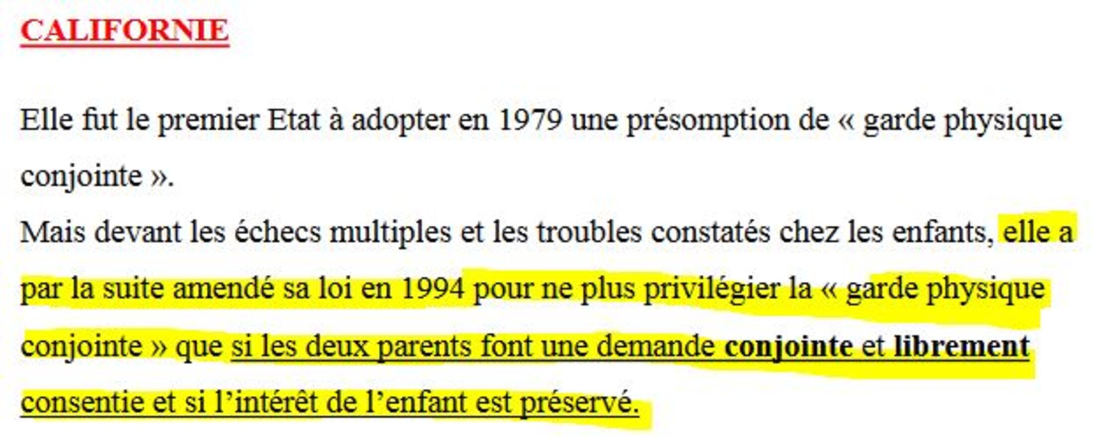 La Californie, notamment citée en exemple dans cet argumentaire frauduleux, n'a jamais modifié sa législation à l'égard de la résidence alternée [3].