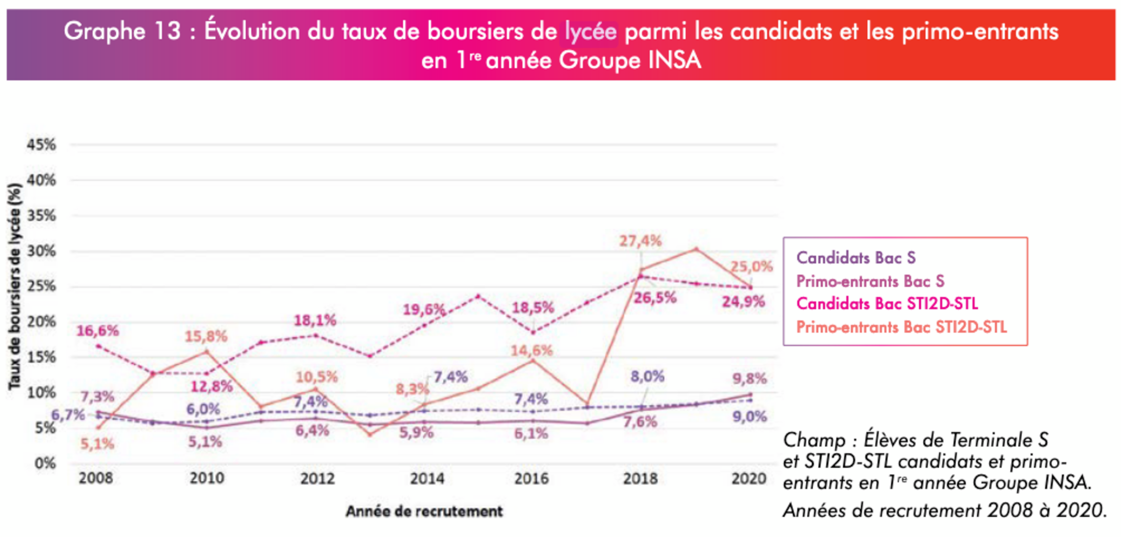 Dans un deuxième temps, le peu de données existantes tend à montrer que les populations "défavorisées" continuent au contraire de candidater à l’INSA, et même, candidatent davantage, comme le suggère l’évolution du taux de boursiers lycéens parmi les candidat·e·s qui est en hausse relativement constante depuis 2008.
