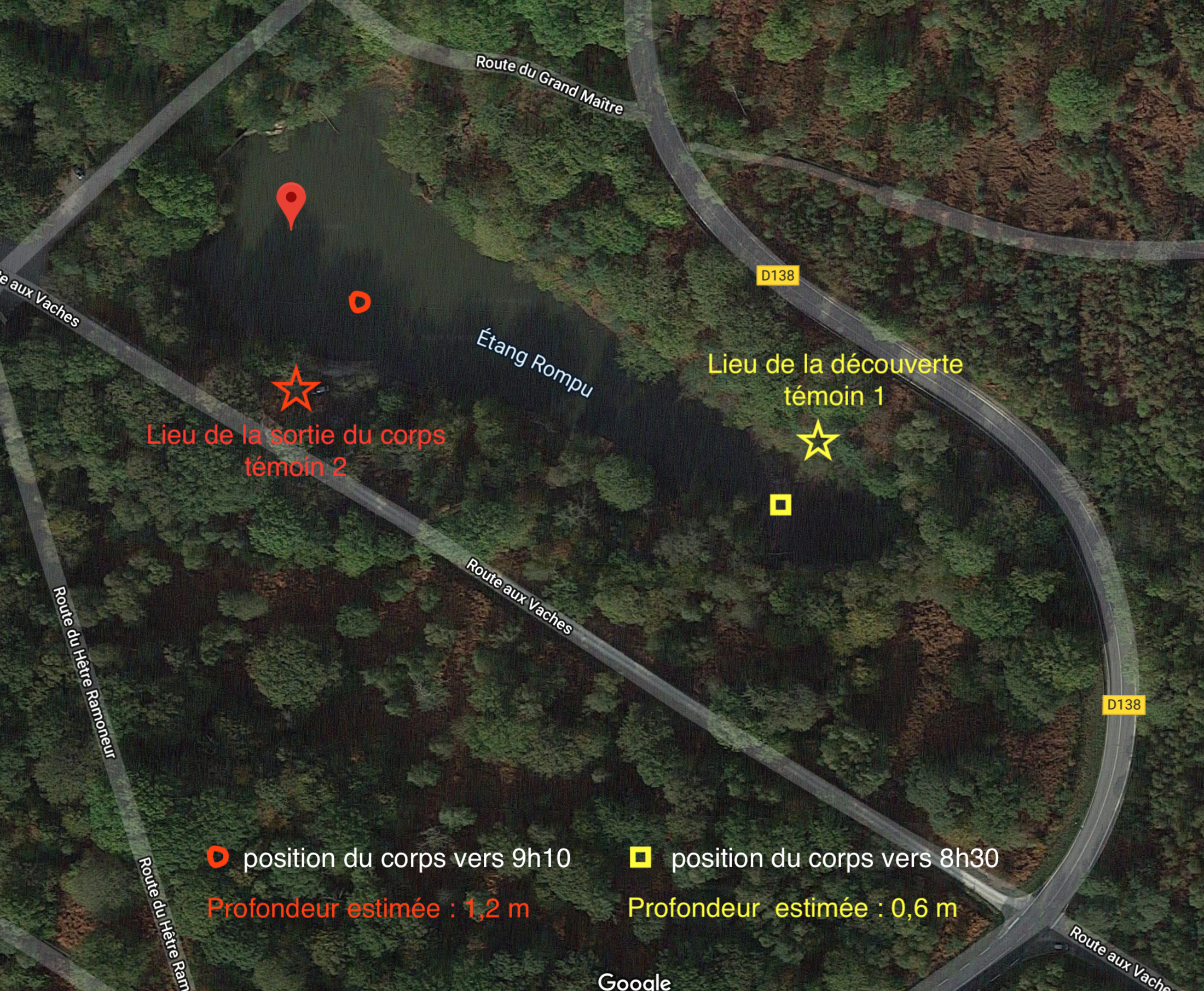 Notre témoin assista à la sortie du corps, située dans ses souvenirs sur l'axe perpendiculaire à la berge sur sept mètres, les deux pompiers retournant le corps délicatement sur le dos à l'approche de la berge opposée au virage du surplomb de l'étang, et à trente mètres de l'endroit où le vit le premier témoin parti depuis une demi-heure au moins ! A cet endroit, la profondeur de l'étang est bien supérieure à celle mesurée au premier signalé par le premier témoin, soit environ 1,20 m...