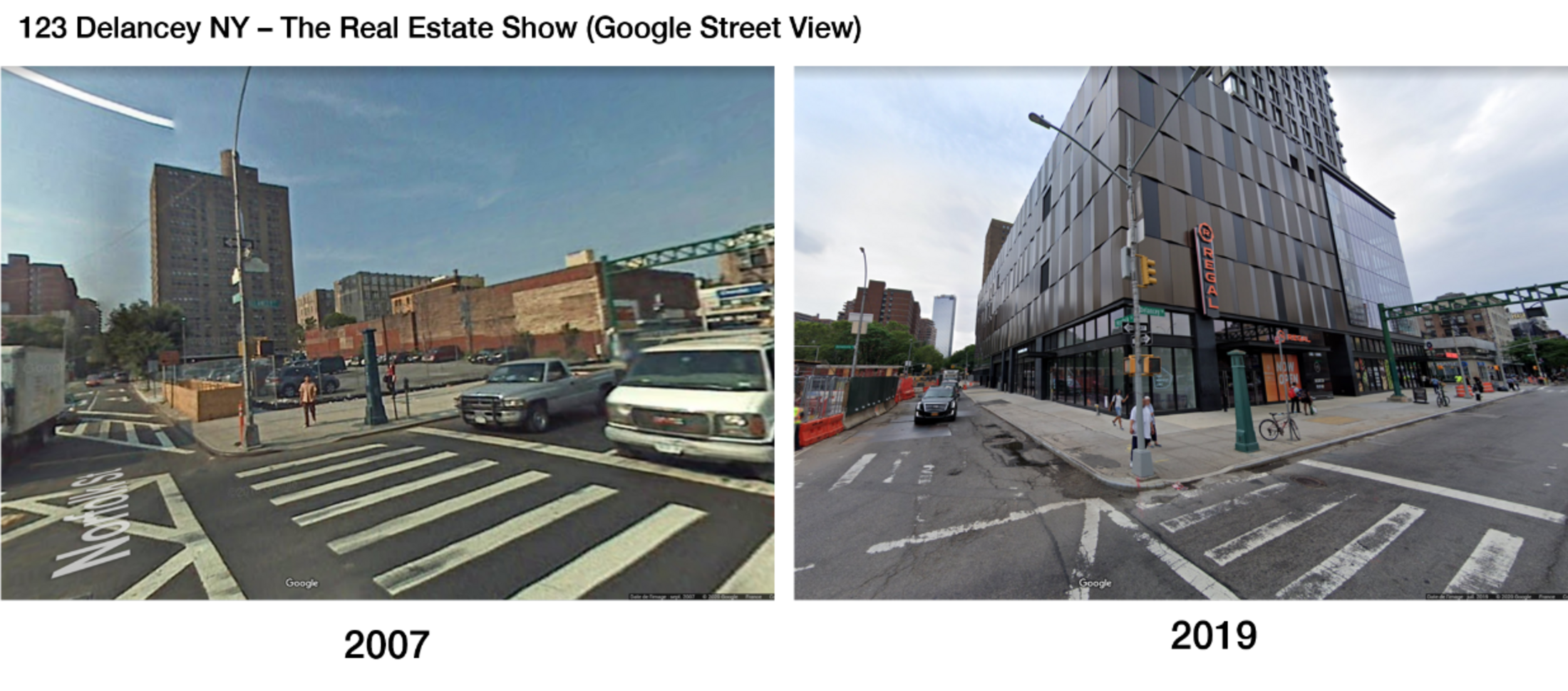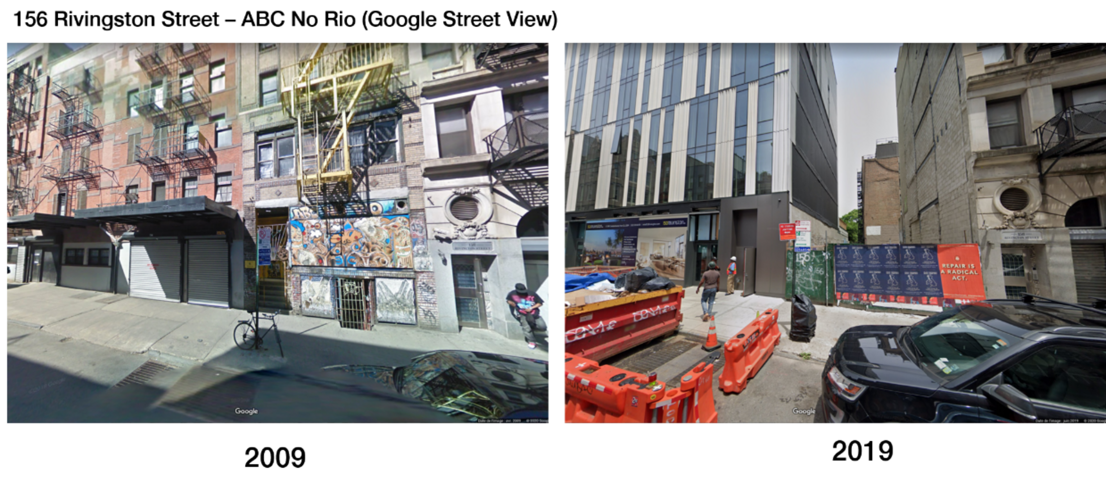 Suite à leur éviction de l’immeuble de Delancey Street en 1980, Collab a obtenu l’autorisation de la part de la municipalité d’investir un autre immeuble à proximité pour développer leur activité (ABC No Rio). Le bâtiment est actuellement en cours de démolition / reconstruction, et rappelle encore une fois l’institutionnalisation des squats d’artistes menées par certaines municipalités, alliant stratégie de marketing territorial et levier de rénovation urbaine par le haut. L’évolution des deux lieux occupés par Collab est quant à elle révélatrice des phénomènes classiques de valorisation des centres villes métropolitains, notamment par l’accueil d’enseignes commerciales ou d’activités tertiaires. The Real Estate Show n’aura duré que trois jours et son impact sur l’art contemporain aura été limité. Mais quarante ans plus tard, les revendications de ses organisateurs résonnent tout particulièrement face aux dynamiques urbaines actuelles. Reste à savoir si les acteurs de la Ville sauront y prêter attention.