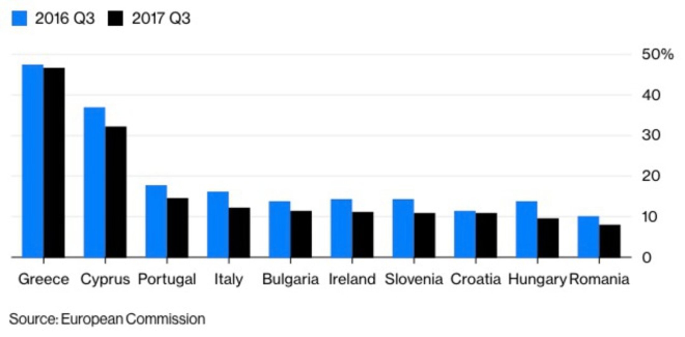 Le mois de Mai dernier est marqué par de triomphants coups de clairon en provenance de Bruxelles : on nous annonce le retour du "printemps grec", marquée par une croissance de 1,4% pour 2017 et évaluée à 2,5% pour 2019. Le chômage recule, mais reste tout de même à 21%. Ici, si le crétinisme était une discipline olympique réservée aux politiques, ils seraient nombreux à concourir, mais la médaille d'or reviendrait sans contestation possible à Pierre Moscovici, qui ose parler de la solidarité (tu parles, Charles !) qu'a affichée l'Union vis-à-vis de la Grèce. Le retour sur les marchés financiers n'est pas loin !