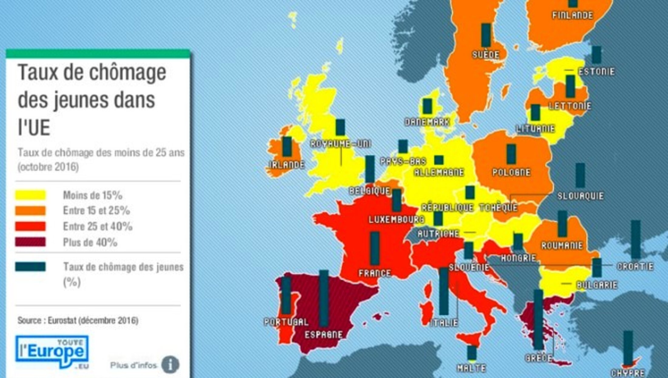 Mais ce qui interpelle le plus, c'est la carte du chômage des jeunes (voir image ci-dessus) : dans tous les pays cités plus haut, il s'établit à un taux au moins deux fois plus élevé que le taux de chômage général. Dans sa lutte obsessionnelle contre le surendettement, l'Europe sacrifie sa jeunesse !