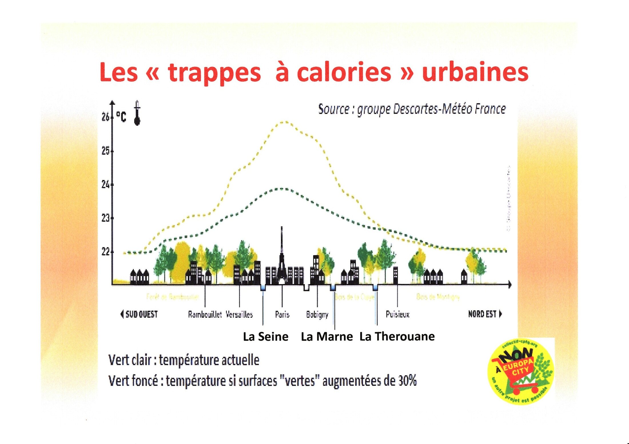 C'est une étude de Météo France qui révèle qu'au centre-ville de Paris, la température est environ 4°C plus élevée qu'à la périphérie (courbe claire). Une augmentation de 30% des espaces agricoles ou forestiers atténuerait cette différence de façon signicative (courbe foncée). Paris est particulièrement sensible au réchauffement, cat elle possède beaucoup moins d'espaces verts que Londres ou Berlin. Et les canicules de l'été dernier montrent que Paris n'a pas besoin de réalisations qui aggravent cet état de choses.