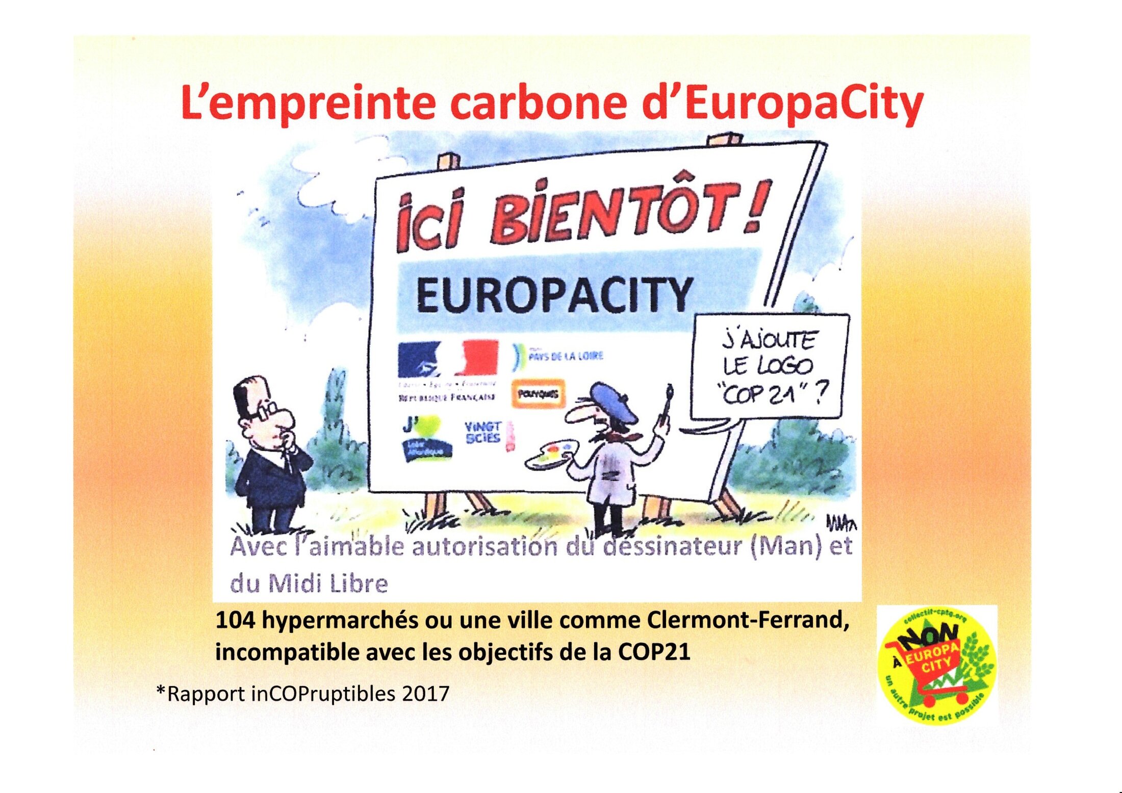 S'agissant de l'empreinte carbone d'EuropaCity, celle-ci méritera de figurer dans le livre Guiness des records, car le projet réaliserait le tour de force de concentrer sur une surface de 80 hectares le bilan carbone d'une ville de 140000 habitants. Le projet est donc clairement incompatible avec les objectifs de la COP21.