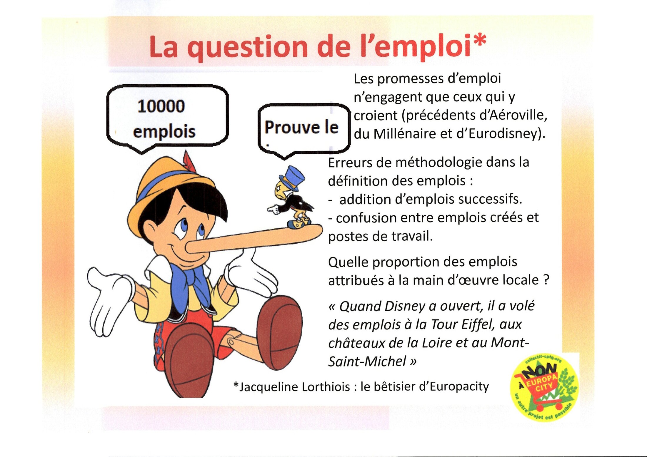 La promesse de 10000 emplois créés sont fallacieuses pour au moins trois raisons : d'abord parce que les précédents comme le Millénaire, Aéroville ou même Eurodisney montrent que ces promesses ne sont jamais tenues.