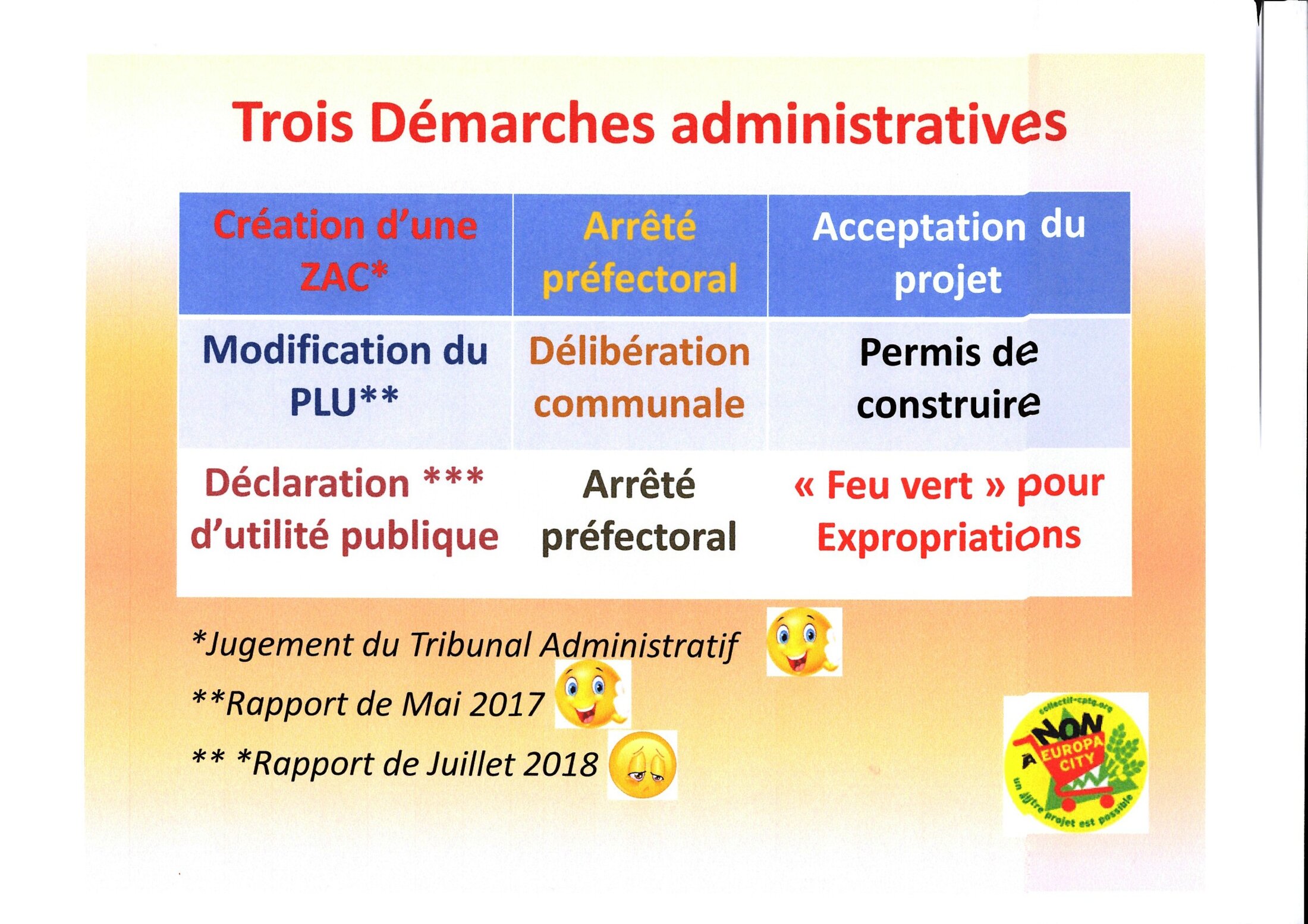 La réalisation du projet est conditionnée par trois démarches administratives, soit du ressort de la préfecture de région, soit d'une délibération communale. La création d'une zone d'aménagement concertée (ZAC) conditionne la faisabilité du projet. La modification du plan local d'urbanisme (PLU) prélude à l'obtention du permis de construire. La déclaration d'utilité publique permet les expropriations.