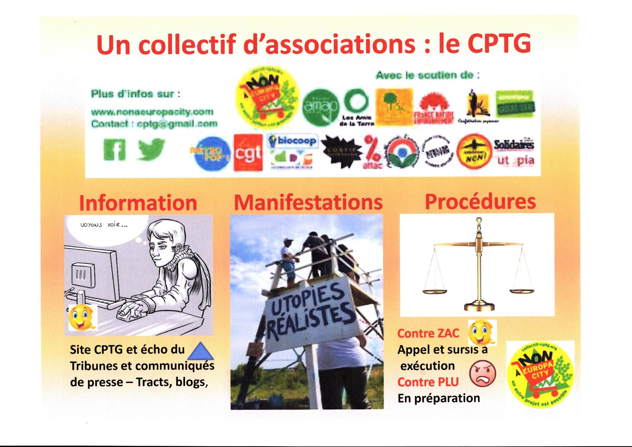 Le collectif pour le triangle de Gonesse (CPTG) est le fer de lance de l'opposition à Europacity. Il regroupe des associationa aussi diverses que leq AMAP, les amis de la terre, ATTAC et même notre Union Locale de Paris Nord2. Il s'oppose au projet par tous les moyens classiques : information, manifestation, procédures. Trois procédures sont actuellement en cours ou en projet et le CPTG a mis plusieurs avocats sur le coup.