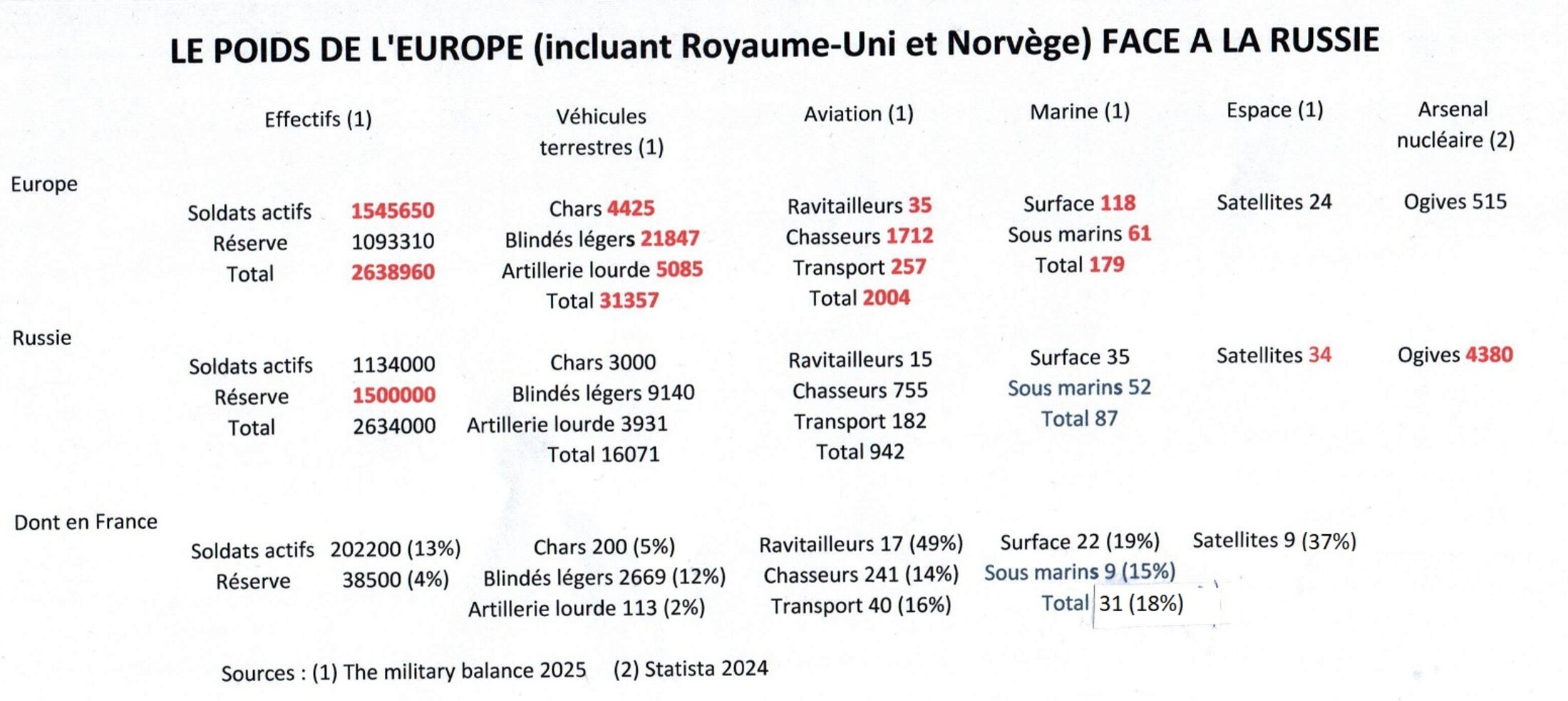 La question du réarmement de l'Europe suscite de nombreuses questions à résoudre: d'abord celle des équipements de défense à fabriquer en priorité : le tableau ci-dessus fait état de déficits européens en matière de satellites de renseignements et d'arsenal nucléaire, mais ces déficiences existent aussi dans d'autres secteurs : commande de drones à distance, missiles de longue portée, défense aérienne non-adaptée aux agressions par missiles ou drones.