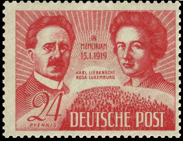 Timbre commémorant Karl Liebknecht et Rosa Luxembourg tous deux assassinés en 1918 et qui sont restés fidèles au Socialisme.