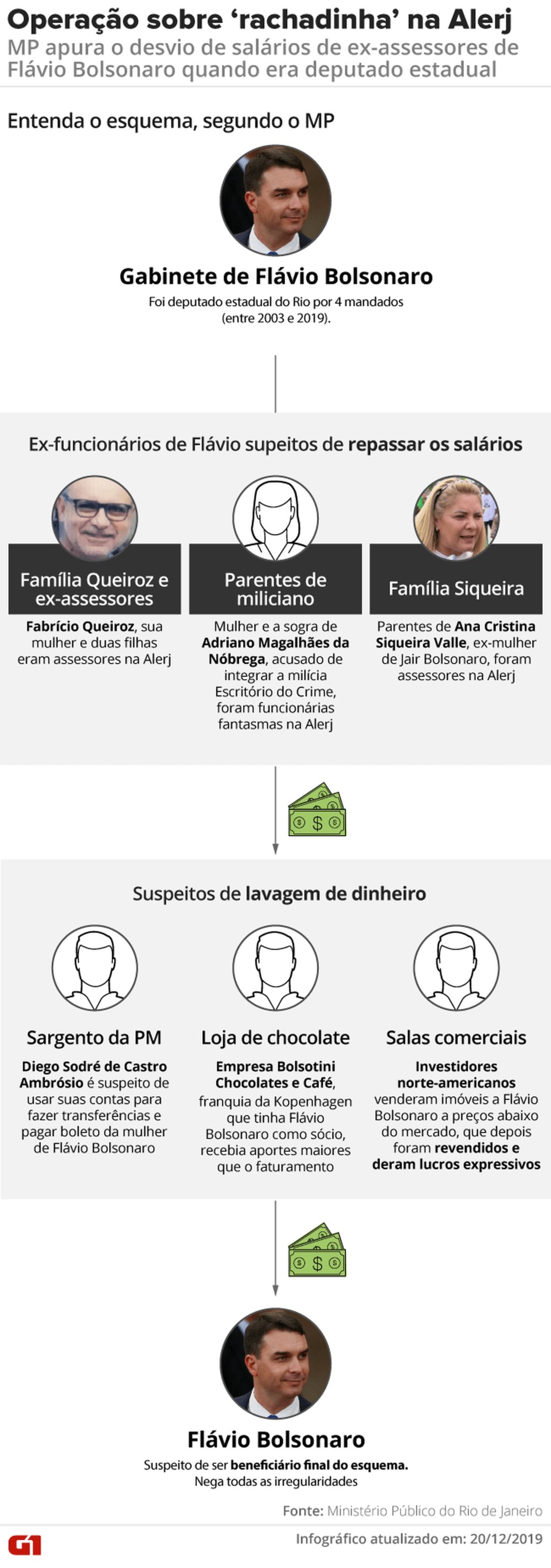 Depuis plus de deux ans, Flávio Bolsonaro, fils aîné du président Bolsonaro et sénateur, fait l'objet d'une tentaculaire enquête policière, puis judiciaire, pour être soupçonné de diriger une organisation criminelle qui détournait grande part des salaires de son personnel de bureau - des dizaines d'assistants parlementaires - lorsqu'il était député, de 2003 à 2018, à l'Assemblée législative de Rio de Janeiro. Une pratique connue sous le nom de « rachadinha ». Son homme de main et ex-assistant parlementaire Fabrício Queiroz, ex-policier militaire et ami de Jair Bolsonaro depuis quarante ans ou presque, est écroué depuis plusieurs mois.