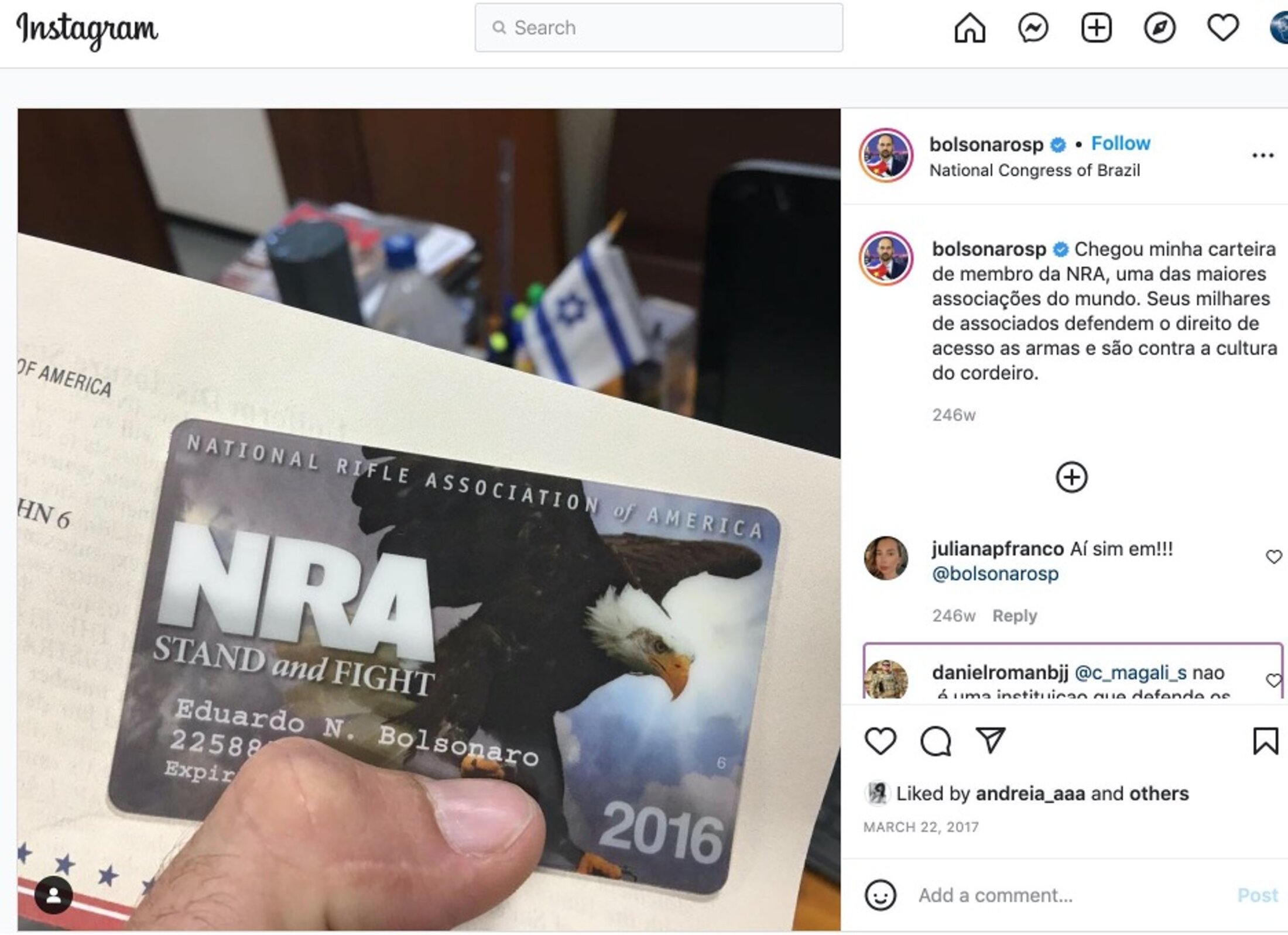 Lors du Shot Show 2017, Eduardo Bolsonaro s'est rapproché de la National Rifle Association (NRA) et de l'industrie américaine des armes à feu, avec l'aide de la célébrité brésilienne du jiu-jitsu, Royce Gracie. Depuis 2016, Eduardo Bolsonaro avait sa carte d'adhérent à la NRA (photo ci-dessous, issue de son compte Instagram).