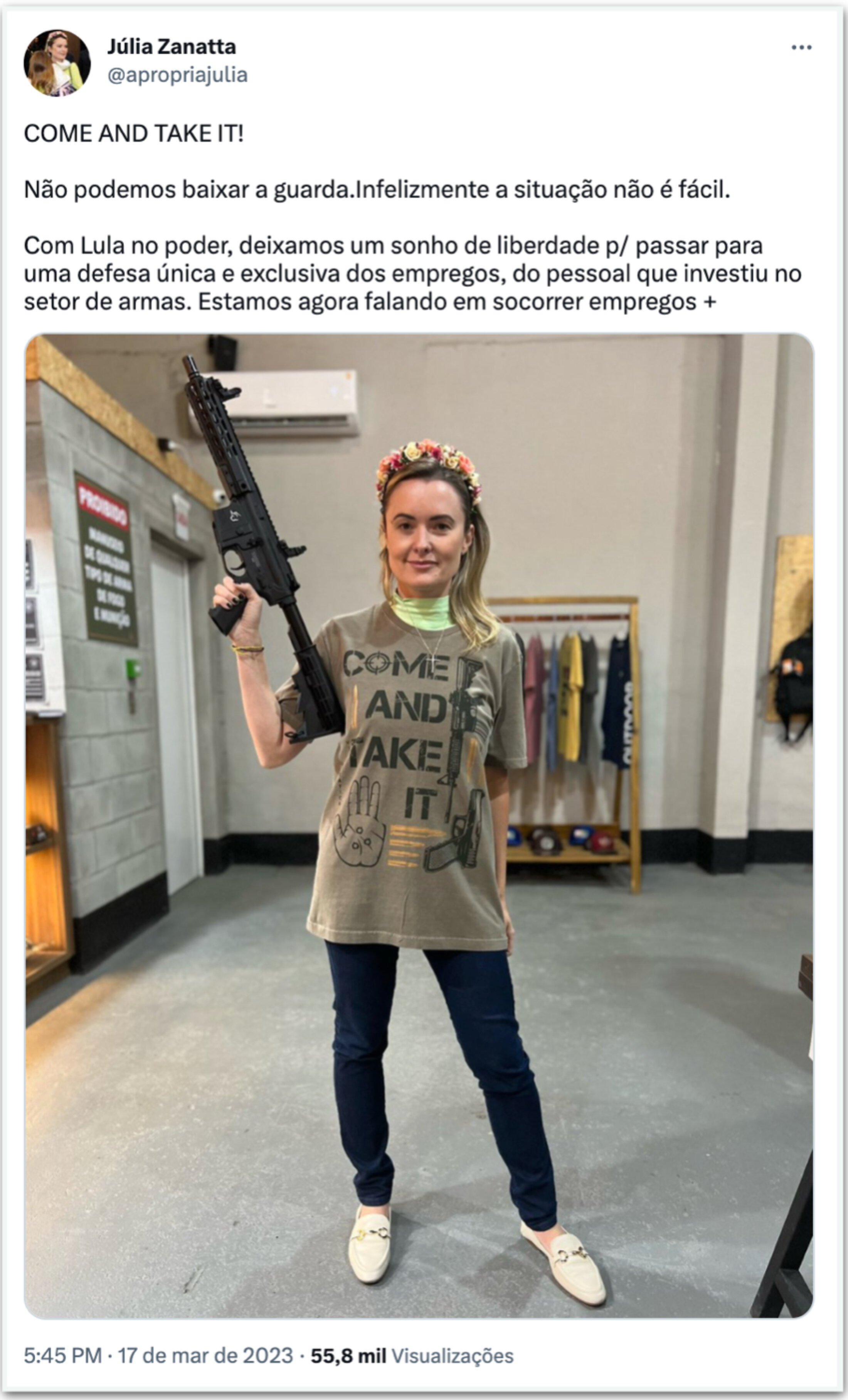 En septembre 2018, Júlia Zanatta était la girl friend du Brésilien Tony Eduardo de Lima e Silva Hoerhann, instructeur au club de tir états-unien "88 Tactical", et co-propriétaire du club brésilien de tir Clube de Tiro .38, qui est basé à São José, en grande périphérie de Florianópolis, capitale de l'Etat de Santa Catarina, lorsque ce club a donc fait les gros titres après l'"attentat" au couteau contre Jair Bolsonaro.