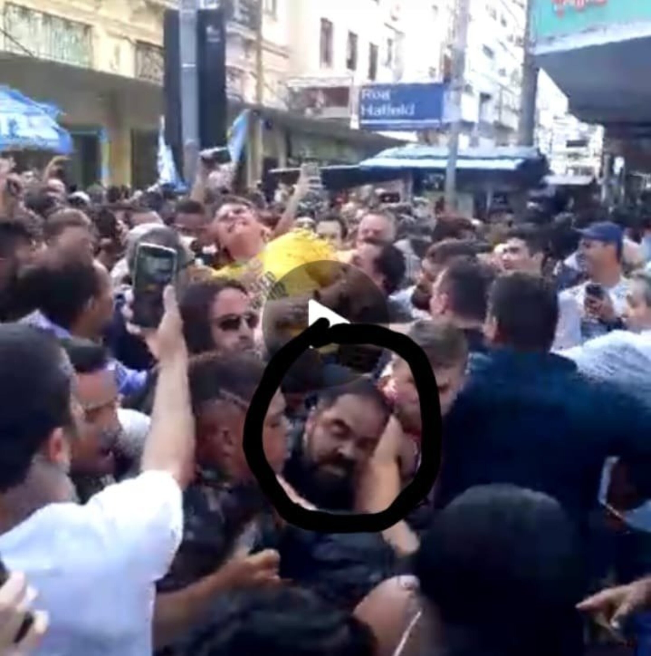 Sur cette autre photo ci-dessous, prise le 6/6/2018, à gauche de l'homme au tee-shirt colorié sans manches et à droite du chevelu aux lunettes noires, l'on voit Hugo Ribeiro (collier de barbe) au-dessus d'Adélio Bispo (blouson noir) qui a la tête tournée vers le sol, juste après le coup de couteau.