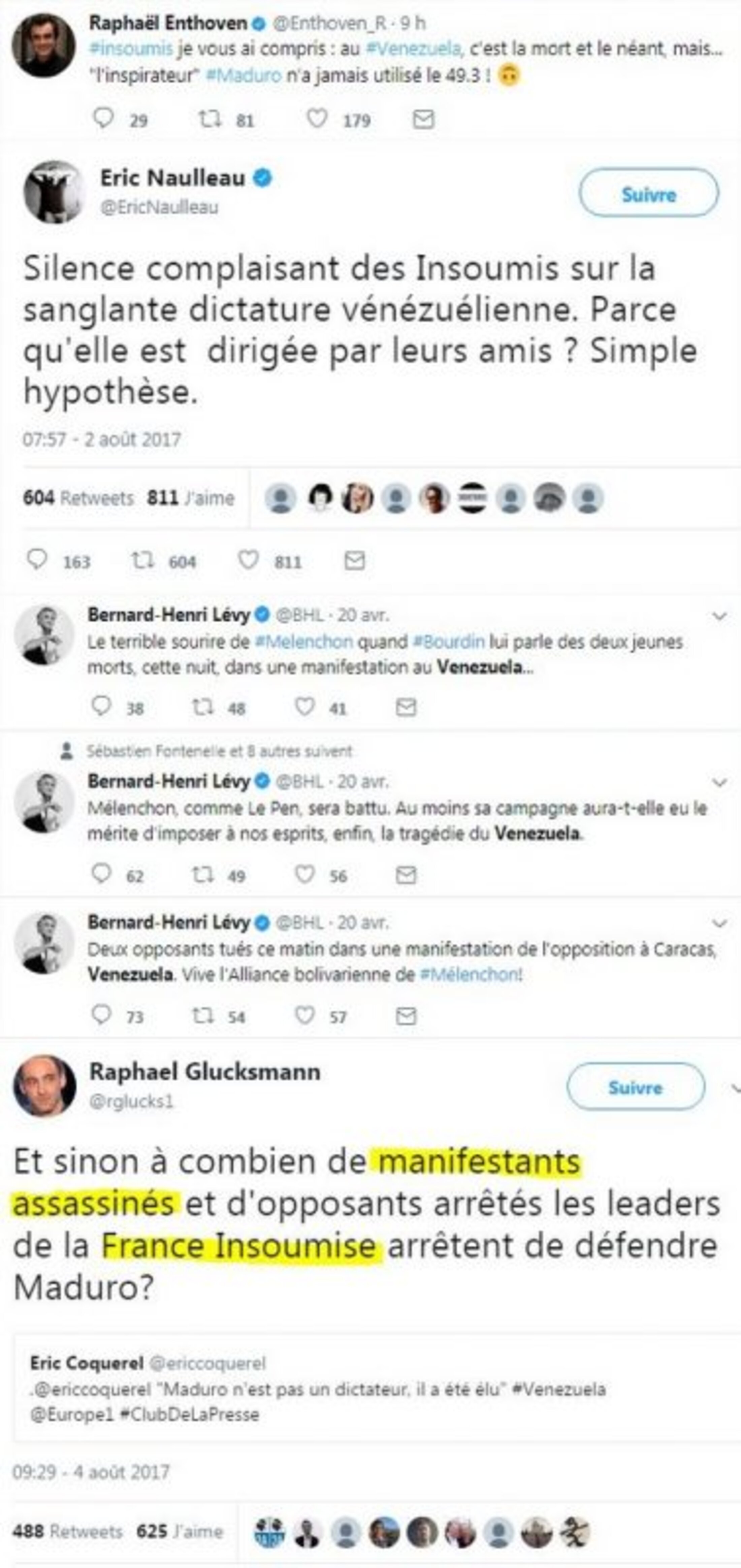 Après avoir publié une interview de Christophe Ventura en contradiction avec sa ligne éditoriale, certes relayée sur sa page Facebook à une heure creuse et tardive (lundi 31/07/2017 à 21h41) et sans véritable accroche, L’Obs renoue avec la stratégie d’instrumentalisation du dossier vénézuélien pour faire le procès de la gauche antilibérale française en relayant sur Facebook le surlendemain, cette fois-ci à une heure de pointe (18h30 pétantes), un article intitulé « Venezuela : La France Insoumise peine à expliquer sa position sur Maduro », agrémenté de la photo choc d’une accolade entre Hugo Chávez et Jean-Luc Mélenchon. Le texte introductif précise qu’un tweet a refait surface. Un tweet qui date de… 2013. Plutôt que d’informer les lecteurs sur la situation au Venezuela, la priorité semble donc être de mettre l’accent sur des enjeux purement intérieurs. Une avalanche d’articles dénonçant les « ambiguïtés » de la France Insoumise s’abat sur la presse hexagonale. Le Lab d’Europe 1 se demande « comment la France Insoumise justifie les positions pro-Maduro de Mélenchon ». A France Info, on semble avoir la réponse : « désinformation », situation « compliquée » : comment des députés de La France Insoumise analysent la crise vénézuélienne ».