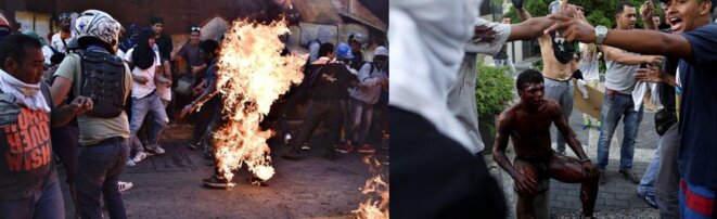 A gauche, des guarimberos trop souvent présentés dans notre presse comme des manifestants non violents. A droite, des militaires blessés par une explosion, le jour de l’élection pour la constituante. Une vidéo de l’attaque relayée par le Times : https://www.youtube.com/watch?v=_aZeqpD4ggM