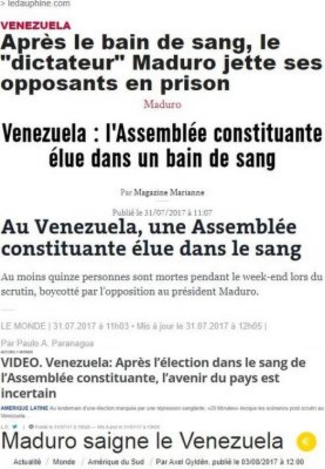 Les titres d’articles jouent également un rôle fondamental dans la propagation de la matrice médiatique « Maduro = dictateur vs manifestants = démocrates réprimés dans le sang ». Et Marianne de titrer sur « l’assemblée constituante, élue dans un bain de sang », faisant écho au titre d’une vidéo de 20 minutes « Venezuela : après l’élection dans le sang de l’Assemblée constituante, l’avenir du pays est incertain », au titre de l’article du Dauphiné « après le bain de sang, le dictateur Maduro jette ses opposants en prison », à celui de L’express « Maduro saigne le Venezuela » ou encore au titre d’un article du Monde « Au Venezuela, une assemblée constituante élue dans le sang », signé par Paulo Paranagua, le journaliste chargé du suivi de l’Amérique Latine du quotidien, particulièrement décrié pour sa couverture de l’actualité vénézuélienne. A cet égard, Thierry Deronne, un belge installé de longue date au Venezuela, a écrit et publié, cette année, sur son blog, un article décryptant le traitement pour le moins discutable du Venezuela par Le Monde et Maurice Lemoine, ancien rédacteur en chef du Monde Diplomatique, s’était fendu, en 2014, d’un courrier au médiateur du Monde à ce sujet.