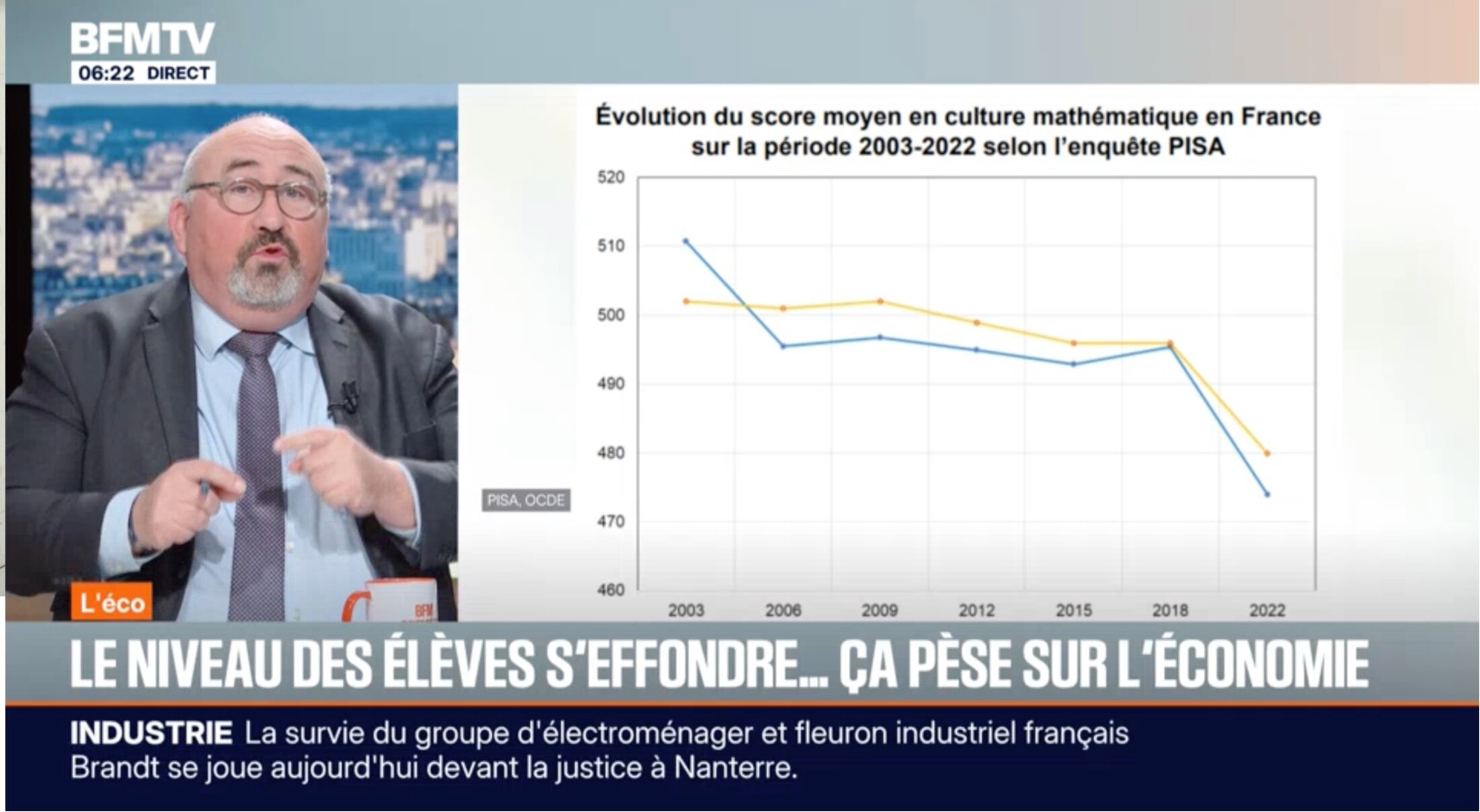 Je cite longuement: « En France, la performance scolaire des élèves se dégrade dans le temps et en comparaison aux autres pays. Les évaluations nationales montrent une baisse en mathématiques et en français des performances scolaires depuis 30 ans. L'enquête du programme international pour le suivi des acquis des élèves (PISA) confirme cette baisse, plus rapide que dans les autres pays, bien que la performance de la France reste proche de la moyenne de l'OCDE. Les performances scolaires en France demeurent, au sein des pays de l'OCDE, parmi les plus fortement corrélées à l'origine sociale et présentent d'importants écarts de genre