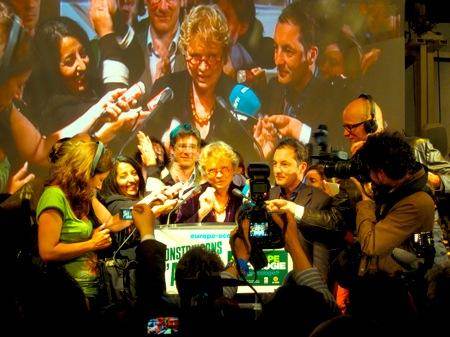 Hier soir à la Belleviloise, Éva Joly parlait un peu d'elle-même. C'est une femme, elle fait partie des gens. La victoire des écolos, est évidemment dûe à tous les militants, mais surtout probablement à l'ouverture. Les verts ont réussi enfin à ouvrir la fenêtre et à sortir de leurs chapelles, à offrir aux élécteurs quelqu'un comme Éva Joly qui parle vrai et qui a l'air d'être sincère sans travail d'interprétation. Ce qui était beaux hier soir c'est de voir dans la même salle Stéphane Hessel et des membres de Génération Précaire. Il me semble que ce vote démontre l'évidente mobilisation de l'ensemble des Français à propos du dérèglement climatique (et cela au delà même des élections) mais également le besoin absolu d'avoir des hommes et surtout des femmes politiques qui ne soient pas des professionnels de la profession. Espérons que cet date marque la fin des experts, des stroytelleurs, et autre conseillers occultes. Il faut que les conseillers soient les payeurs, qu'ils mouillent la chemise et qu'ils se présentent au suffrage universel. Et surtout que cela tourne, plus d'éléphants des petites souris...