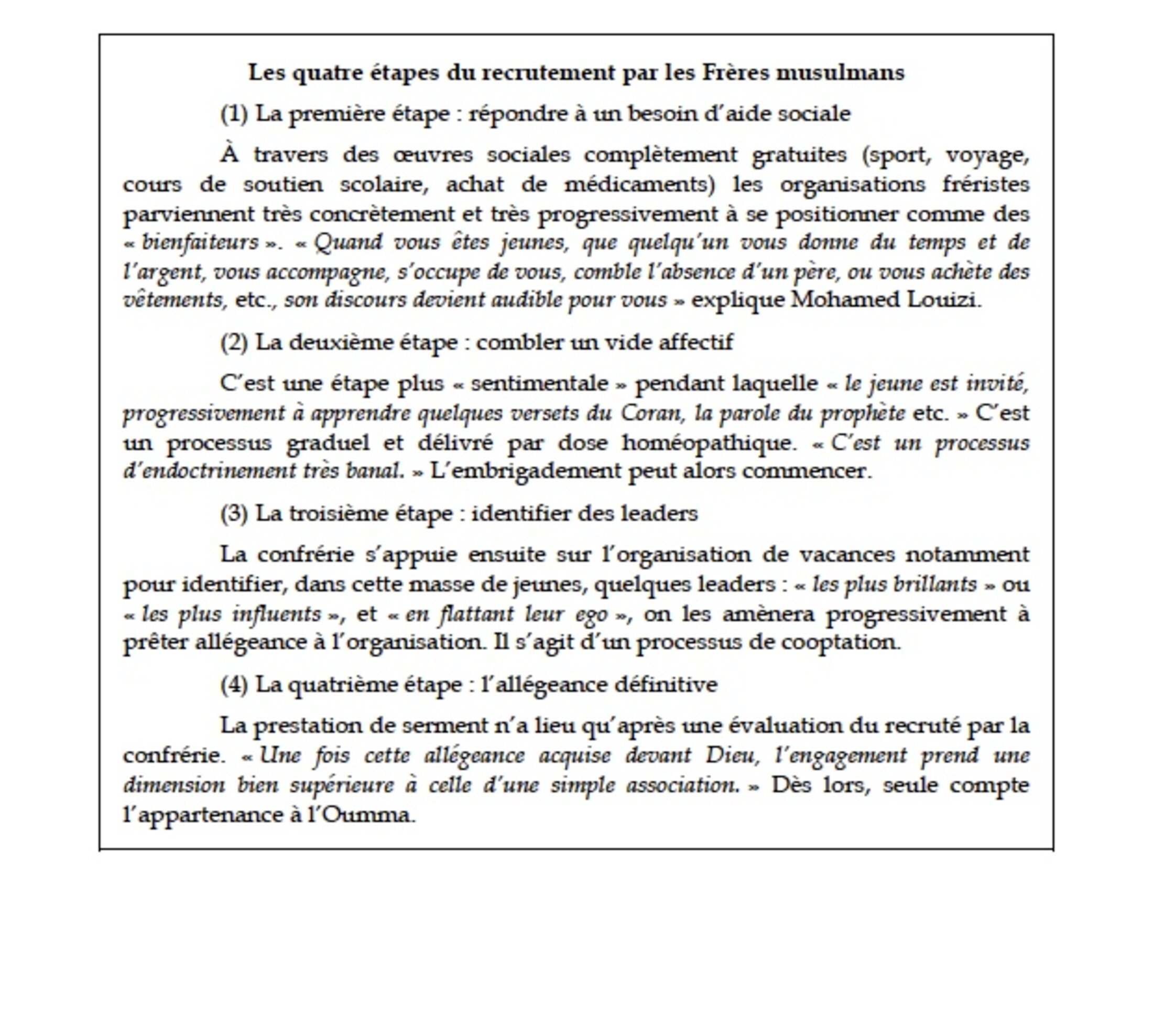 Je propose, ici, une capture d'écran, extrait du rapport. Les "frères" recruteraient à travers des œuvres complètement gratuites. Sur la base de cette "constatation" il paraît logique de déduire un tout autre programme que celui que le rapport propose: tout un système de répression... Répéter "l'ordre, l'ordre, l'ordre" ce n'est pas combler l'"absence de père", être bien veillant, donner du temps et de l'attention...