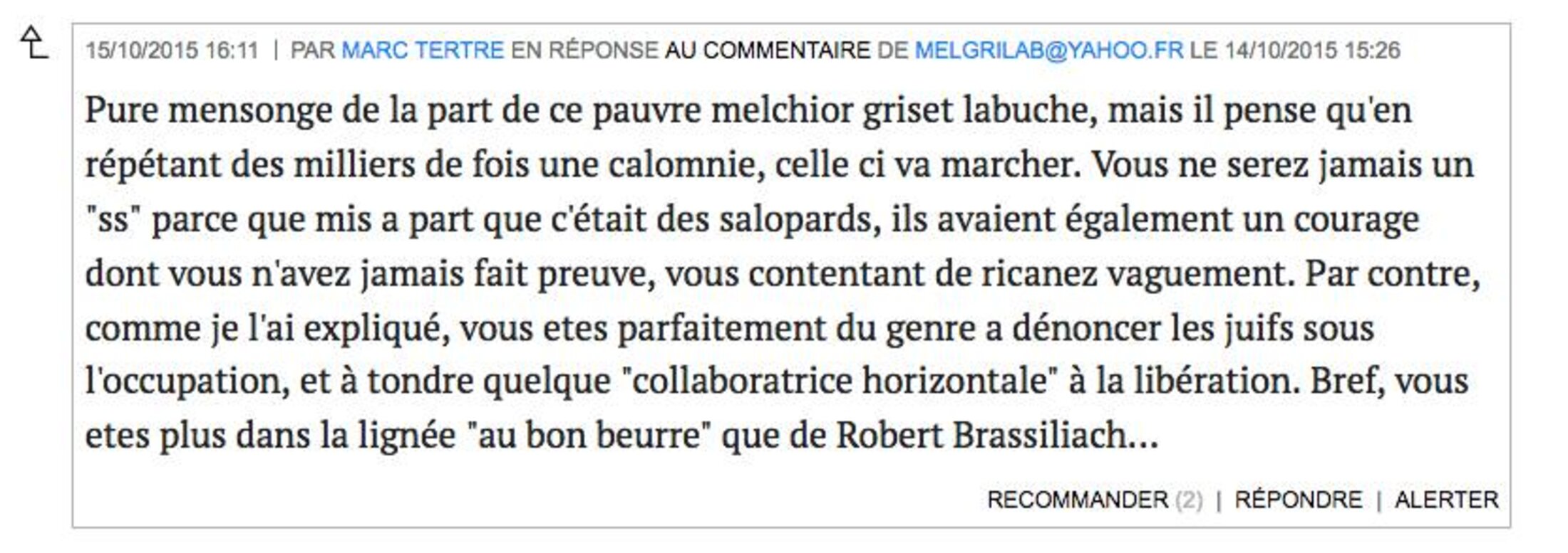 Donc, pour se justifier d'une ignominie, Tertre vous explique que comme elle était accompagnée d'autres propos du même niveau, si vous n'avez pas contesté les autres propos, c'est exactement comme s'il n'avait rien dit de mal.