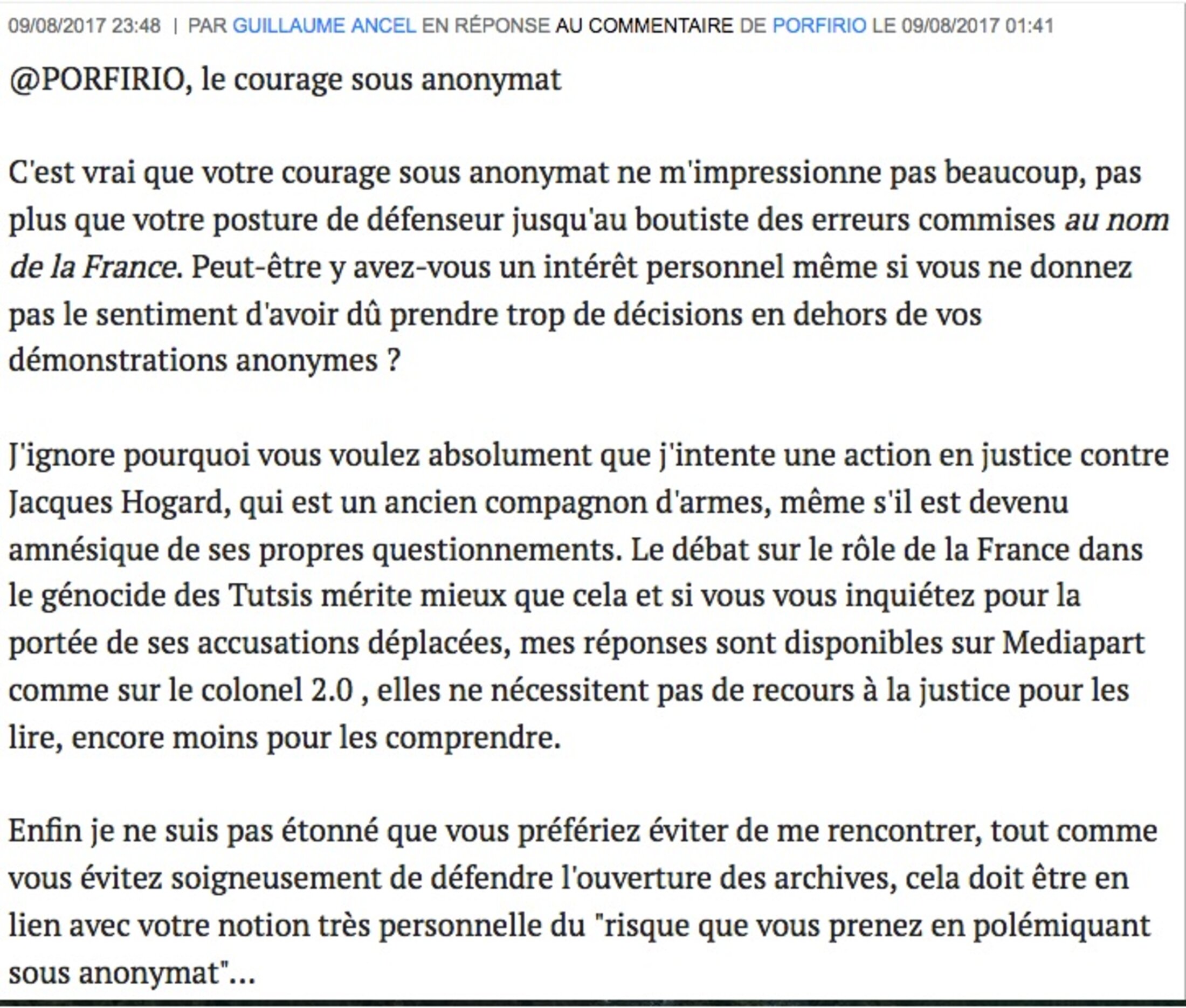 Figurez-vous qu'il y peu le capitaine Ancel se réveille et vient démentir les propos du Colonel Hogard, me traitant au passage de suppôt de l'extrême-droite alors qu'il n'a jamais attaqué les propos en justice. Comme je le lui fais observer avec quelques remarques acerbes sur le caractère éphémère de la célébrité, il fait dépublier ma réponse. C'est que quand le capitaine Ancel s'exprime sur Médiapart, on ne réplique pas.