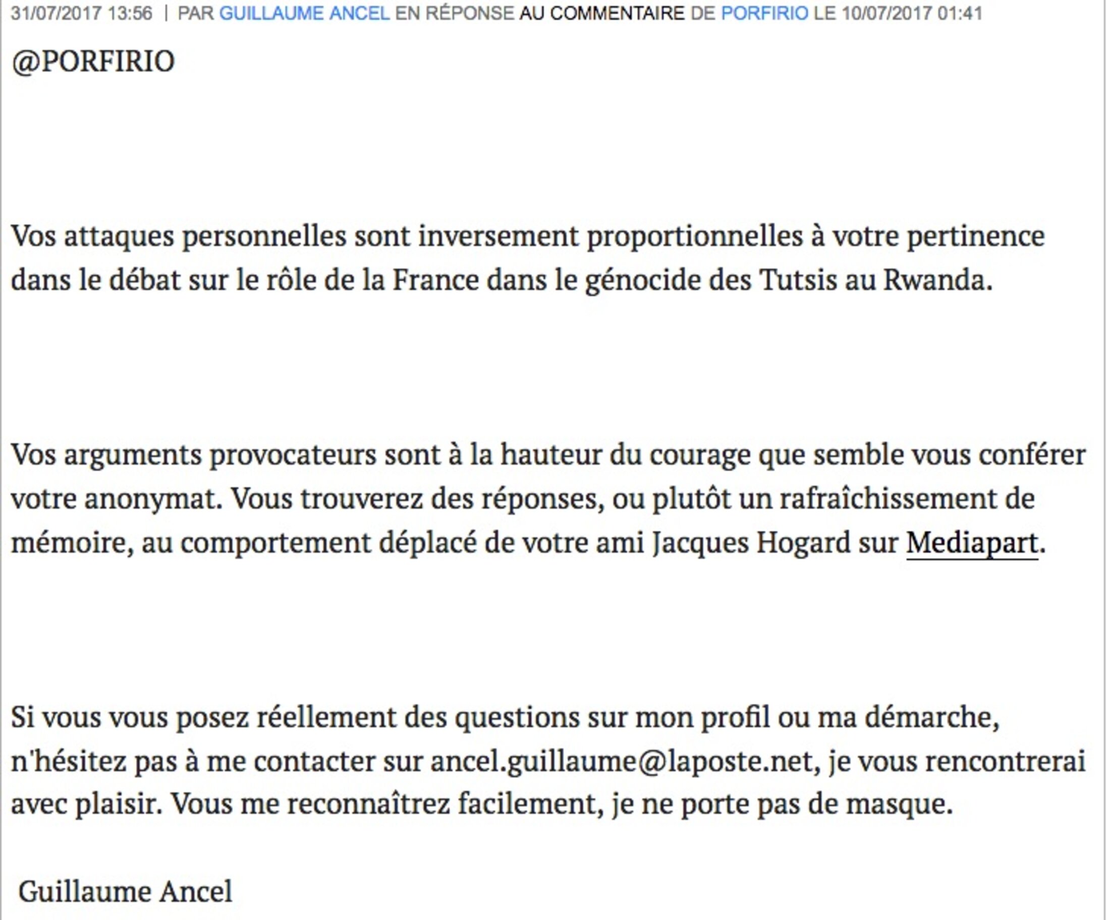 En revanche, j’en eus bien une de la part de Guillaume Ancel qui, après m’avoir traité de lâche parce que je contribue sous pseudo me proposa de le rencontrer pour me convaincre de sa bonne foi. L’offre me parut peu intéressante, compte-tenu de la suite notamment.