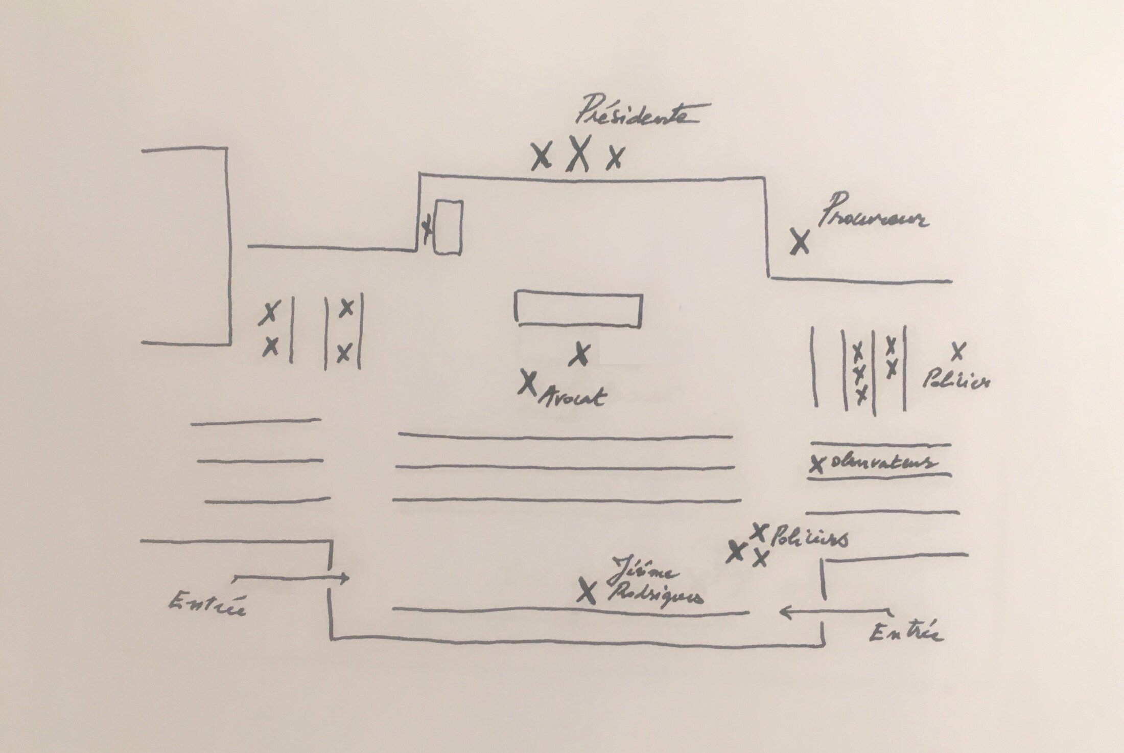 Dans la salle, le téléphone de mon voisin de droite se met à sonner. Un policier s’approche, il s’excuse, dit qu’il s’agit de son réveil, et sort de la salle d’audience pendant quelques minutes.